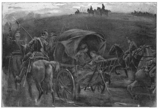 On, on, hammering the flinty road with steel-shod hoofs, racing with the racing clouds, thundering across the pontoon, where benumbed soldiers huddled to stare, then bounding forward through the narrow lanes of hamlets, where pinched faces peered out at us from hovels, and gaunt dogs fled from us into the frozen hedge.