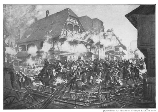 Before the drenched artillery had rattled out of Morsbronn the rain once more fell in floods, pouring 7 a perpendicular torrent from the transparent, gray heavens, and the roar of the downpour on slate roofs and ancient gables drowned the pounding of the passing cannon.