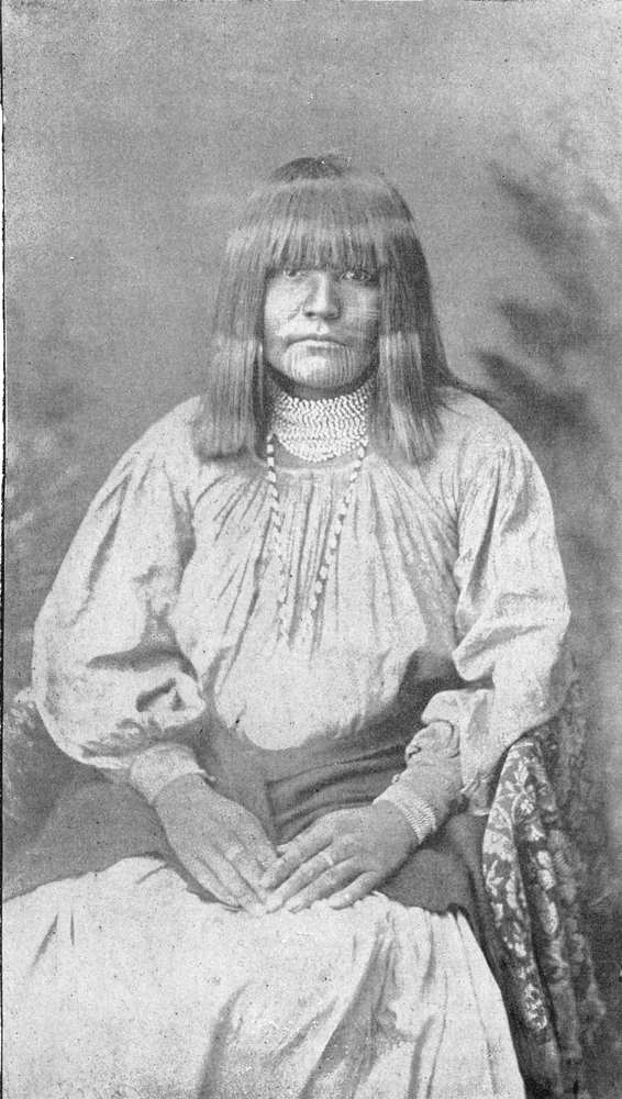 It will be observed from the accompanying picture I am enabled to present of her, that she is of but medium height, of a good figure, and well developed. As among most Indian women her hands and wrists are very large, and this also applies to her feet, which cannot be seen in the illustration. She shows no tattoo-marks or mutilations anywhere upon her face or body, though in this statement must not be included the fact of the removal of all hair except that which grows so abundantly upon the head and the brows. This latter is black, rather long, and frequently dressed. It is worn parted for a short distance in the middle in front; drawn off the face, and braided up and tied behind. She wears no ornaments in her hair beyond the wrappings of her braid. Her skin is smooth and [Pg 8]of a tawny chocolate color, and her head well-poised upon her rounded shoulders.