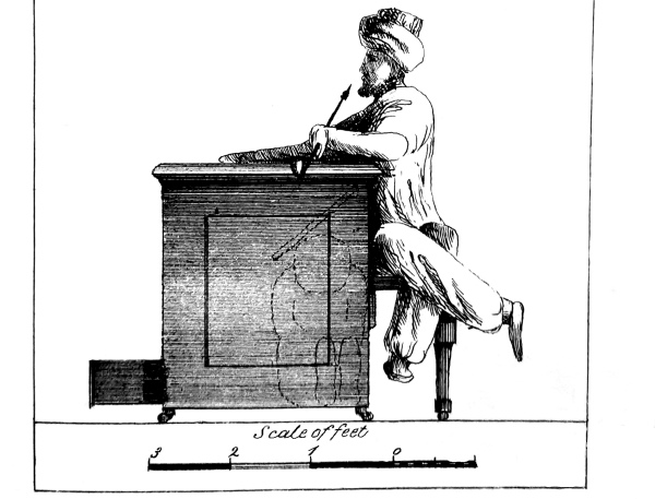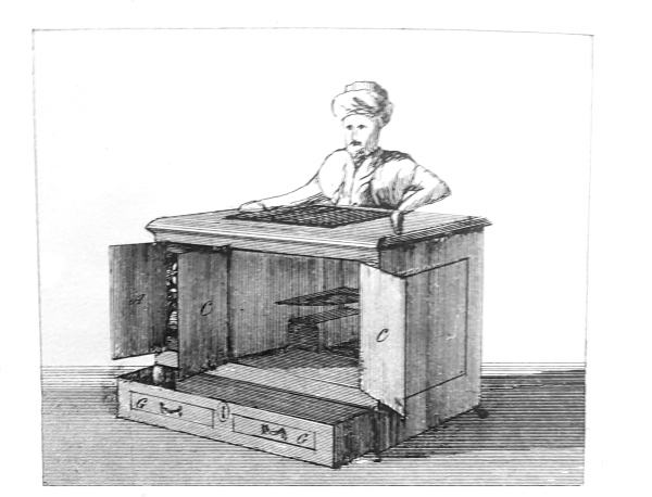 I shall now pass on to the third division, and point out a method by which any person, well skilled in the game, and not exceeding the ordinary bulk or stature, may secretly animate the Automaton, and successfully imitate the movements of Mr. De Kempelen’s Chess Player.