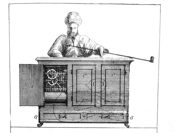 In order to facilitate the introduction of the player’s left arm into the arm of the figure, the elbow of the latter is obliged to be drawn backwards; and to account for, and conceal, this strained attitude, a pipe is ingeniously placed in the Automaton’s hand. This pipe must not be removed till the other arrangements are completed.