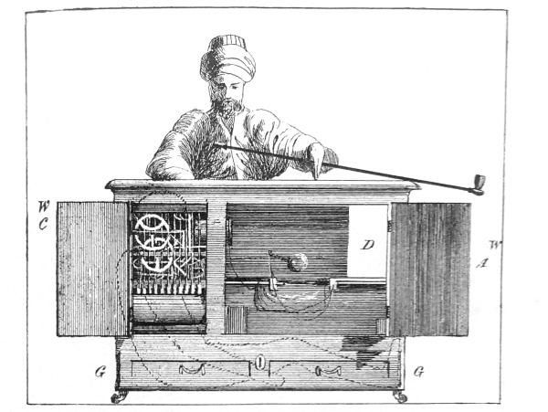 At the commencement of the exhibition the spectators are gratuitously made acquainted with the interior of the chest, which is divided into two unequal compartments, and occupied by pieces of machinery, so arranged, as apparently to render the concealment of any human being impossible. When the movements of the Automaton begin, the beholders, in the first moments of surprise, and in the absence of any ostensible living cause, very naturally refer the effect to the mechanism, which has been exhibited; and with likelihood enough, for the movements immediately follow the familiar action and well known sound of winding up clockwork, and are moreover very skillfully accompanied by the grating noise of moving wheels. But, these indications excepted, where [Pg 17] is the evidence that the machinery moves, or that the slightest influence is exerted by it on the arm of the Automaton? The whole is excluded from view, and a moment’s reflection will convince any one that no stress can be laid on the winding up, nor on the accompanying sounds, which are imitable in various ways.
