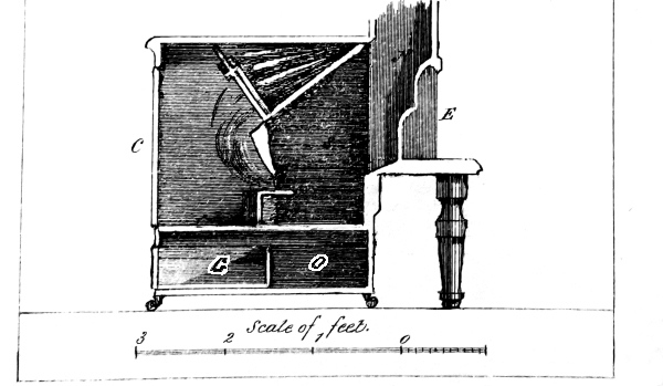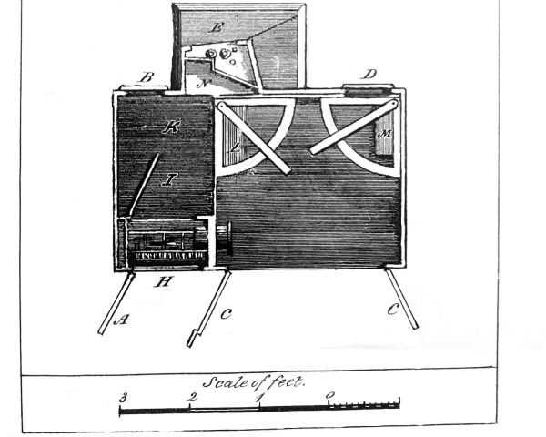 The annexed drawings, (plate 1, figs. 1 and 2,) represent the general appearance of the machine. It runs on castors, and is either seen on the floor when the doors of the apartment are thrown open, or is wheeled into the room at the commencement of the exhibition. [Pg 6]