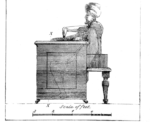 When the doors in front have been closed, the exhibiter may occupy as much time, as he finds necessary, in apparently adjusting the machinery at the back, whilst the player is taking the position described in figs. 7 and 8. In this position he will find no difficulty in executing every movement required of the Automaton: his head being above the table, he will see the chess board through the waistcoat, as easily as through a veil; and his left hand extending beyond the elbow of the figure, he will be enabled to guide its hand to any part of the board, and to take up and let go a chess man with no other “delicate mechanism” than a string communicating with the fingers. His right hand [Pg 31] being within the chest, may serve to keep in motion the contrivance for producing the noise, which is heard during the moves, and to perform the other tricks of moving the head, tapping on the chest, &c.