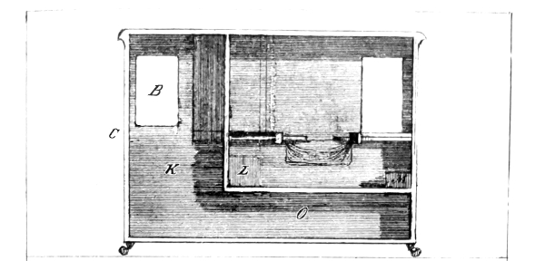 The drawer (gg, plate 5,) when closed, does not reach to the back of the chest; it leaves a space (o) behind it, about 1 foot 2 inches broad, 8 inches high, and 3 feet 11 inches long. This space is never exposed to view.