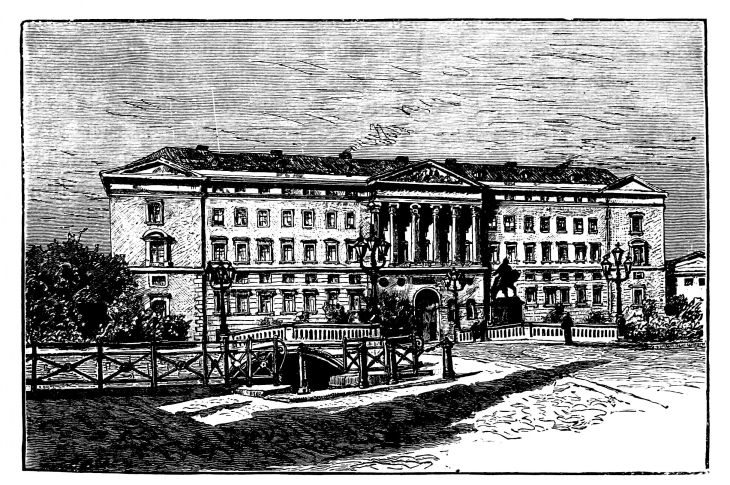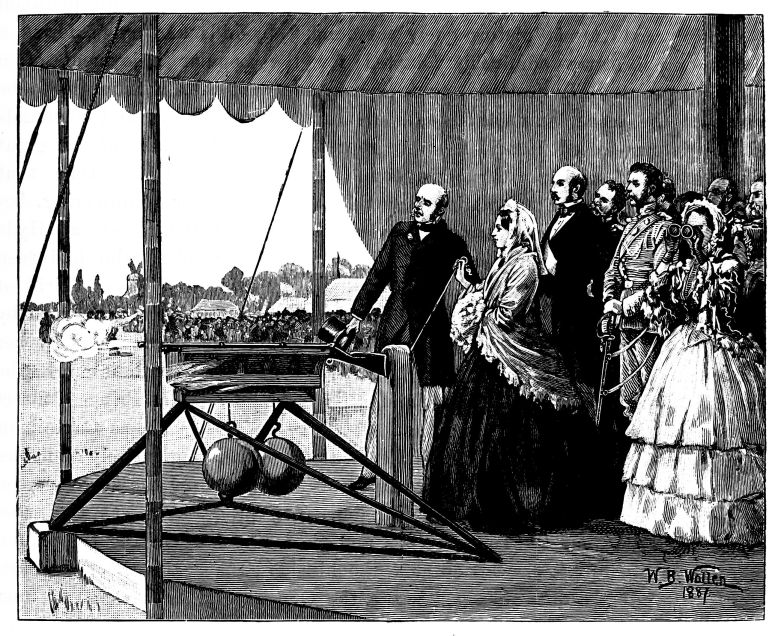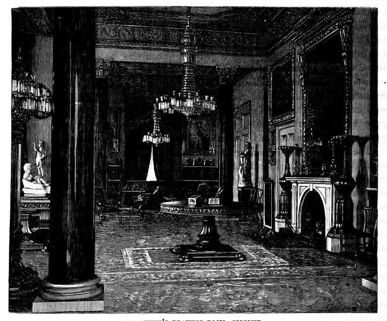 The family life of the Court had been brightened early in the year by the cordial welcome which the Queen’s eldest daughter had received in her new home in Prussia. Projects for a visit to her and her husband were formed by the Queen and the Prince Consort, which public duty compelled them to abandon month after month. On Maundy Thursday the Prince of Wales was confirmed at Windsor, having acquitted himself well during his examination by the Archbishop. After a fortnight’s tour in Ireland, it was arranged that he should live in the White Lodge, Richmond Park, and prepare for his military examination, his companions being Lord Valletort, eldest son of Lord Mount-Edgecumbe, Major Teesdale, R.E., one of the heroes of Kars, Major R. Loyd-Lindsay (afterwards Lord Wantage), V.C., and Mr. Gibbs, the Prince’s tutor. In May a visit from the beautiful Queen of Portugal charmed all hearts, and during the Whitsuntide holiday, when the Prince Consort went to pay a flying visit to Coburg, the Queen solaced her loneliness by visiting Prince Alfred at Alverbank, a cottage opposite the Isle of Wight, where he was pursuing his naval studies. Delightful letters came to the Queen from Babelsberg, describing the married happiness of her daughter, who received the Prince Consort there, and from whence he returned to London on the 8th of June.