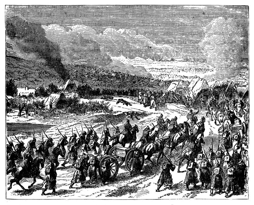The Ranee of Jhansi and Tantia Topee had now concentrated an army of 20,000 men at Kalpi, and held an entrenched position at Kunch. Here, on the 7th of May, Rose defeated them, and his pursuit was so fierce and unresting that hardly a single fugitive escaped. Another rally was made at Kalpi, which was seized on the 23rd of May, the flying Sepoys being cut and shot down by hundreds, no quarter being given or taken. “Soldiers,” said Sir Hugh Rose, in his proclamation to the Central India Field Force, “you have marched more than a thousand miles, and taken more than a hundred guns; you have forced your way through mountain passes and intricate jungles, and over rivers; you have captured the strongest forts, and beat the enemy, no matter what the odds, wherever you met him; you have restored extensive districts to the Government,{4} and peace and order now reign where before for twelve months were tyranny and rebellion; you have done all this, and you have never had a check.” Led by a dandy, who might almost be termed the Alcibiades of the Indian army, the Central India Field Force had carried fire and sword from the shores of Western India to the waters of the Jumna, and literally quenched the spirit of the insurrection in blood. But fresh work awaited Rose and his followers. Tantia Topee had organised a conspiracy against Scindia at Gwalior, whose contingent had, early in the Mutiny, revolted from his standard. Instead of waiting for British help, Scindia insisted on striking at the conspirators with such troops as he had still attached to his household. When he attacked the enemy at Barragaom, his followers deserted him, and he had to fly, with a small escort, to Dhólpoor, leaving the great fortress of Gwalior, with its vast stores of arms and munitions of war, to be occupied by the rebels. This gave fresh life to the Mutiny: the Nana Sahib promptly proclaimed himself Peishwa, and took the field with a new army of 18,000 men, strengthened by the superb artillery of Gwalior. But the news of this terrible misfortune did not daunt Sir Hugh Rose. He immediately resumed the command of the Central Field Force, which he had laid down, and made a dash for Gwalior. On the 16th of June he surprised the rebels at Morar, where he waited for one of his brigades, which came up on the 17th. He drove the enemy before him, like chaff before the wind, tearing them to pieces by fierce onsets of cavalry, in one of which a trooper of the 8th Hussars slew the dreaded Ranee of Jhansi, who fell fighting in male disguise. On the 18th the rebel army was in full retreat, and on the 20th Scindia took possession of his capital, the sack of which by the rebels cost him the loss of £500,000 of treasure, jewels, and other property. Nana Sahib’s broken army alone kept up a faint semblance of rebellion in Oudh towards the end of 1858.