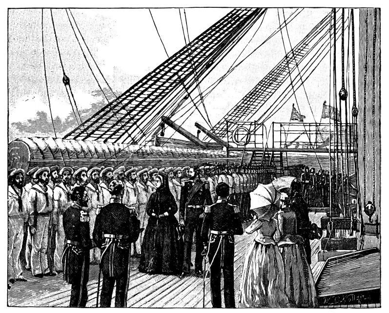 In May the Emperor of the French had sent the Queen an invitation to come and inspect the fortifications at Cherbourg. At this time the friction between France and England had been somewhat increased by a divergence of view between the two countries as to the settlement of the Danubian Principalities. England, by opposing their union, had irritated France. France, by refusing to admit that the engagements entered into by Napoleon III. at Osborne in 1857 bound her to support the English view, had annoyed England.[30] It was, however, thought that the Queen’s personal popularity in France, and her influence with the Emperor, might bring about friendlier relations between the Governments, and the Ministry pressed her to accept the Imperial invitation. Writing on the 5th of August, the day after the Queen’s arrival at Cherbourg, Lord Malmesbury, who was one of her party, says, “It blew hard in the night, but subsided towards morning. The Queen not ill. The approach to Cherbourg{22} very fine. Arrived there at 7 p.m. At 8 the Emperor and Empress came on board the Royal yacht without any suite. Nobody was admitted. Marshal Pélissier, who went in without any invitation, was immediately turned out by the Emperor.” What passed at this interview, however, was an embarrassing inquiry about the feeling against France in England. “We smiled,” writes the Queen of herself and her husband, “and said the feeling was much better, but that this very place caused alarm, and that those unhappy addresses of the Colonels had done incalculable mischief.” The grand effect of the saluting cannon seems to have impressed the Queen, and, says Lord Malmesbury, “when the Emperor left the Queen’s yacht, the electric light was thrown on the Emperor’s barge, following it the whole way into the harbour; the light shining only on the barge, whilst all around remained in darkness.” The Emperor, adds Lord Malmesbury, “was very friendly in his manner; but both he and the Empress could not digest some of the articles in the Times which had been offensive, especially against her, and I tried to make them understand what freedom the Press had in England, and how independent it was of all private and most public men.” As for the Queen, she says in her Diary that, after this grave visit she “went below,” and “read and nearly finished that most interesting book ‘Jane Eyre.’” On the morrow thunderous salutes smote her ears as she was dressing, and when she went on deck the harbour was literally swarming with craft brave with gala array. “Next morning,” writes Lord Malmesbury of this day’s proceedings, “the Queen, Prince Albert, the Prince of Wales, the Duke of Cambridge, Sir John Pakington, and myself breakfasted at the Préfecture. After which the Royal Personages drove over the town.... Returned to the Royal yacht, and accompanied the Queen to dinner on board the Bretagne. Among the officers at dinner was General Macmahon.” Here the Queen was rendered very nervous because Prince Albert had to make a complimentary speech in reply to the toast of her health, for at that moment every eye in Europe was on Cherbourg, and every ear straining for echoes of Royal and Imperial conversations on which might hang the dread issues of war. “I shook so,” writes the Queen, “that I could not drink my cup of coffee.”[31] All went off well, however, and the kindliest words on both sides were spoken. The display of 25,000 francs’ worth of fireworks ended a brilliant but fatiguing day. August 6th was devoted to leave-taking, amidst a complimentary cannonade, and the Queen got home in time to greet{23} Prince Alfred on his birthday at Osborne. “The evening,” she writes, “was very warm and calm. Dear Affie was on the pier, and we found all the other children, including Baby (Princess Beatrice), standing at the door.” A visit of inspection to Prince Alfred’s birthday presents, a little birthday fête and dance on the terrace, adds the Queen, formed “a delightful finale to our expedition.”[32] But the visit was a mistake, though, as the Ministry insisted on it, the blame was theirs alone. It produced an abundant crop of alarms and attacks in the press on the menacing preparations for war which had been seen at Cherbourg. It caused the Queen to have a controversy with Lord Derby, who would pay no heed to her appeal to provide a counterpoise to the threatening stronghold which she had inspected.
