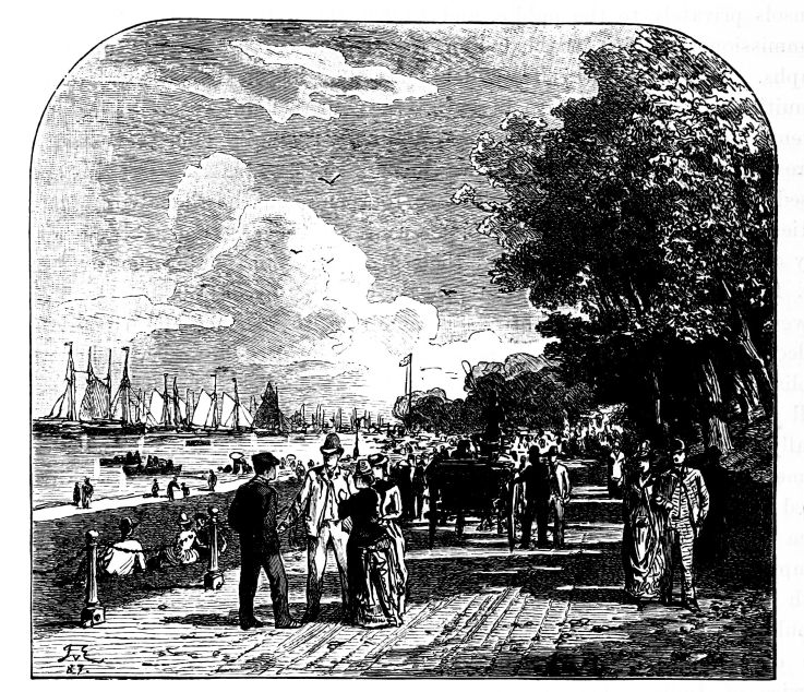 A visit—long promised and long looked for—to the Prince and Princess Frederick William of Prussia followed. Her Majesty’s suite arrived at Potsdam on the 14th of August, and on the same evening the Queen and Prince Albert arrived at Babelsberg, where they were received with a warmth of welcome by their Prussian relatives that made the Queen, as she herself says, feel as if she were at home. The meeting between her and her daughter brought a moment of supreme delight to both. Each day spent in the happy circle of the Prince and Princess of Prussia seems to have knit the heart of the Queen closer to the family of which her eldest daughter was so obviously a cherished member. Every day some fresh mark of attention was paid to the Queen and her husband by their hosts, who seemed to exhaust their ingenuity in devising expedients for making her visit pleasant to her. Though this visit was purely a private one, the people gave her as cordial a reception as the Court, until at last her Majesty began to feel sad at the approaching termination of such a charming holiday. But on the 28th of August the last day came, and, writes the Prince Consort, “the parting was very painful.” The Queen and the Princess Royal wept in each other’s arms, though her Majesty says, with a pathetic reference to the conflicting duties of sovereignty and womanhood, “all would be comparatively easy were it not for the one thought that I cannot be with her at that very critical moment when every mother goes to her child.”[33] Dover was reached on the 31st, from whence the Queen went on to Portsmouth, and thence to Osborne, where they found Prince Alfred, who had passed his examination—especially the mathematical part of it—with great distinction, eager to tell them he had been appointed to the Euryalus. He was waiting for his mother, writes the Queen, “in his middie’s jacket, cap, and dirk, half-blushing, and looking very happy. He is a little pulled down from these three days’ hard examination, which only terminated to-day.... We felt very proud, for it is a particularly hard examination.”[34]{24}