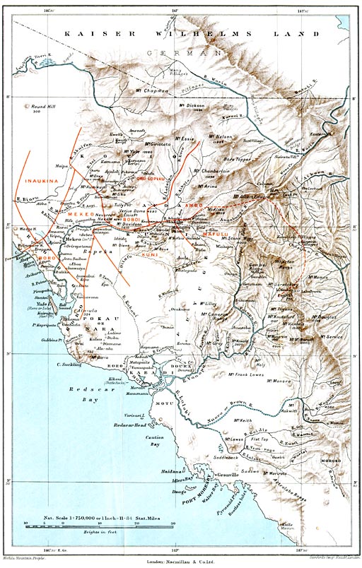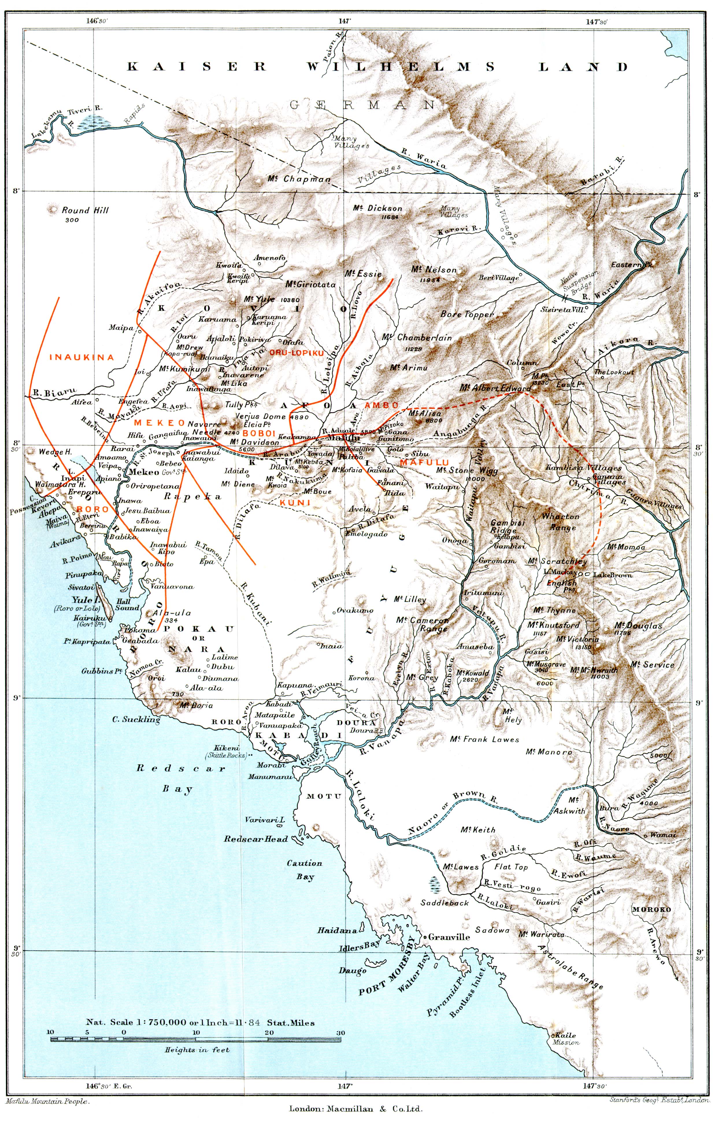 The Koiari people of the foothills and lateral spurs behind the Motu area, also referred to from time to time in Dr. Seligmann’s writings, must be eastern next door neighbours of the Fuyuge-speaking people, the western boundary of these Koiari being stated by him to be the Vanapa river,4 and they being in fact regarded by him as being the eastern neighbours of the natives of “the mountains inland of Mekeo Nara and Kabadi,”5 and being referred to by him as being the people from whose district the Kamaweka and Kuni are reached by “passing westward”—the word used is “eastward,” but this is obviously a printer’s error—“in the mountains, keeping roughly parallel with the coast.”6