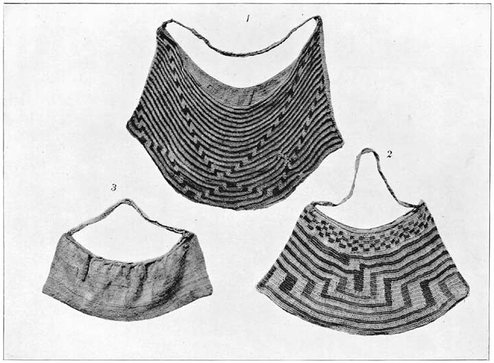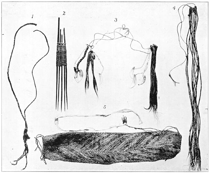 From these it appears that the Upper Chirima people are short in stature and sturdily built. Both sexes wear the perineal band, the front of which is made (I am not sure whether this applies to women as well as to men) to bulge out by padding. In some cases the men’s hair is tied up in a bunch with string, [10]and in others it is bound up in various styles with native cloth. Some of the men have their hair done up in small plaits over the forehead. All the above descriptions, except that of the padding of the band, are applicable to the Mafulu. Some of the Chirima houses have a curious apse-like roof projection over the front platform, which is a specially distinctive feature of a Mafulu house, and one with this projection figured by Mr. Monckton is indistinguishable from a typical Mafulu house. The Chirima people place the bodies of their dead on raised platforms, and apparently sometimes put the body of an infant on the platform erection of an adult, but below the latter. This also is a practice of the Mafulu; and, though the latter people confine platform burial (if such it may be called) to chiefs and their families and important persons, it is possible that some such limitation of the custom exists in the Chirima valley also, but did not come under Mr. Monckton’s notice. A burial platform figured by him might well be a Mafulu burial platform, except that the curious cone-shaped receptacle for the child is a form for which I cannot vouch as regards the Mafulu. The Chirima have a special and peculiar form of netting, which Mr. Monckton’s illustration shows to be identical with the special form of Mafulu netting. On the other hand, as regards the Chirima weapons, implements and utensils, a comparison of Mr. Monckton’s verbal descriptions and figures with what I have seen in Mafulu, and describe in this book, leads me to the conclusion that, though many of these are similar to those of Mafulu, [11]some of them are different. As examples of this I may say that the drill implements of the Chirima people are very similar to, and their stone cloth-beaters appear to be identical with, those used by the Mafulu; whilst on the other hand their war bows are much longer,12 and their method of producing fire seems to be totally different; also they apparently have bull-roarers, which to the best of my knowledge are unknown among the Mafulu. Again some of the Chirima weapons, as figured by Mr. Monckton, disclose ideas of artistic design, including that of the curved line and a rude representation of a man, which I have not met with among the Mafulu. As regards this last point I draw attention to Mr. Monckton’s figures of carving on a bow and on wooden clubs. I think, however, that in such matters as these local differences might well arise between people who are really more or less identical, especially if their respective districts are on opposite sides of the main mountain range of the country, and still more so if the people of one of the districts (in the present case I refer to the Chirima people) may perhaps have been subject to the influence of other people beyond them. As to this latter point, however, I should say that these Chirima people seem to be, so far as dress, ornaments, &c., are concerned, much nearer to the Mafulu than they are to the natives of the Mambare river itself, as described by Sir William Macgregor.13 It is curious [12]also that the dogs of the Chirima people are not yellow dingoes, but are black and white, as is the case in Mafulu.