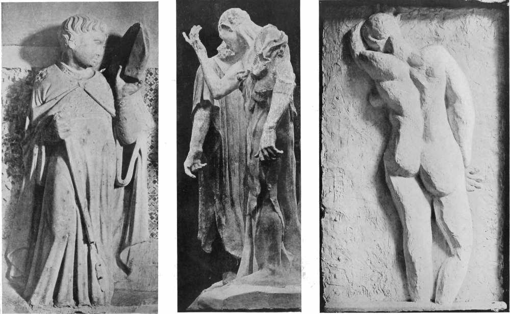 Note.—The original lecture was not illustrated, but the opportunity of publishing this summary of it has suggested the possibility of introducing a few examples to illustrate one point, viz., the extent to which the works of the new movement correspond in aim with the works of early art while being sharply contrasted with those of the penultimate period. This will be, perhaps, most evident in Plate I, where I have placed a figure from the cloisters of S. John Lateran, carved by a thirteenth-century sculptor—then one of Rodin’s Burghers of Calais, and then Matisse’s unfinished alto-rilievo figure. Here there is no need to underline the startling difference shown by Rodin’s descriptive method from the more purely plastic feeling of the two other artists. Matisse and the thirteenth-century artist are much closer together than Matisse and Rodin.
