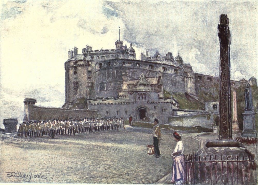 The point where the banks of the Forth are but a mile apart is now spanned by that triumph of engineering, the Forth Bridge,—the largest bridge in the world; but in olden days there was here a famous crossing, and the names of the villages on the opposite banks, North Queensferry and South Queensferry, still carry the mind back to the days when Malcolm Canmore’s stately Saxon Queen, Saint Margaret of Scotland, was ferried across here on her way between the palace of Dunfermline and the Castle of Edinburgh. Edinburgh was not then, nor for centuries after, the Capital of Scotland, but merely a useful stronghold near the Borders,—a great rock rising abruptly among woods and lochs and hills, on which, from before the earliest legends of history, a fortress had stood,—an{5} impregnable castle, built so long ago that none knows its origin, nor even the origin of its name. Stow’s Chronicle, indeed, dates the foundation of the “Castell of Maydens” 989 B.C., which is a sensational date to mention lightly to the inquiring tourist from the newer world. It is supposed that the name “Castell of Maydens” was gained because, in legendary days, certain Pictish princesses were kept there for safety; and certainly, from those hazy times right on till the time of Mary, Queen of Scots, when she was sent to the Castle for security before the birth of King James, Edinburgh Castle has always been a useful place of safety to which to send royalties and rebels.