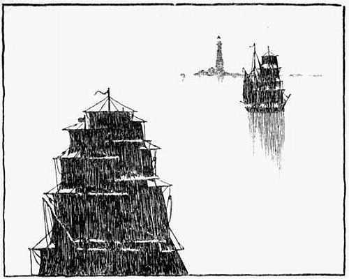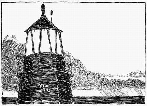 The flash that wheeling inland wakes his sleeping wife to prayer;