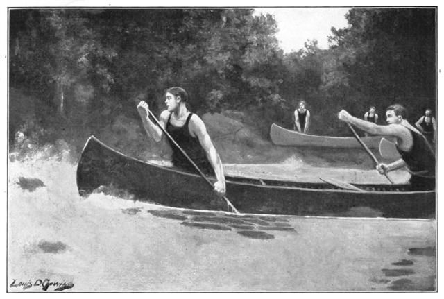 As though to demonstrate more fully his determination, Harvey dipped with a sharper, quicker stroke, put the strength of two muscular arms into his work, and they sped quickly past the turns of their winding course. Perhaps either Tom Harris or Bob White, of whom Henry Burns had spoken, might have wielded the paddles with a bit more of skill, have kept the course a little straighter, or skimmed the turns a trifle more close; but neither could have put more of life and vim into the strokes. A large, thick-set youth was Harvey, strongly built, with arms bronzed and sinewy—clearly a youth who had lived much out of doors, and had developed in sun and air.