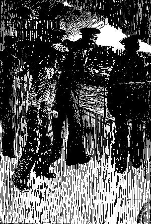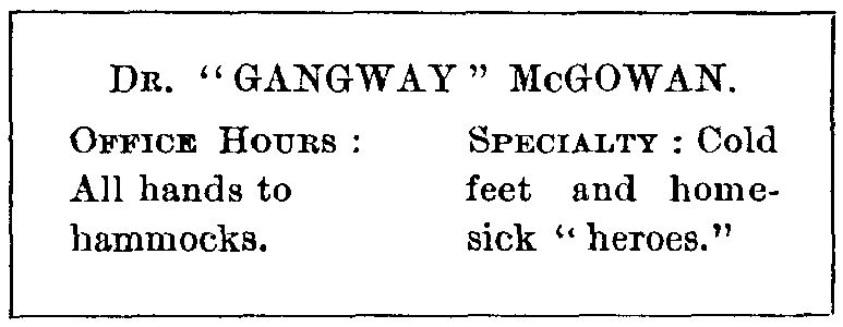 As I write it seems as if I can hear the shrill whistle of the bo'sn's pipe sounding in all parts of the old wooden ship, then the long drawn call "all hands on deck." The men come tumbling up from below, touching their caps in salute as their heads rise above the hatch coaming. Men standing in battalion formation, by divisions, at attention, each man answers "here" as his name is called. Some of the voices are a little husky as the speaker realizes that war is on and he is about to be called for real service.