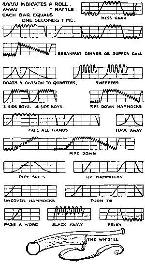 The boatswain's calls or "pipes" are very difficult to reduce to a musical scale, because the pitch of the instrument depends entirely on the amount of energy expended by the blower. The novice, after a few trials, would probably assert that the primitive little whistle had only one note—and not very much of that; but he would be surprised indeed at the volume of sound, the range, and the command over the instrument which a veteran boatswain would soon make everyday matter to him. Not only do these experts sound the regular calls with ear-piercing exactness, but actual tunes are often included in their repertoire.