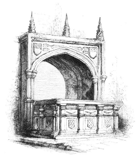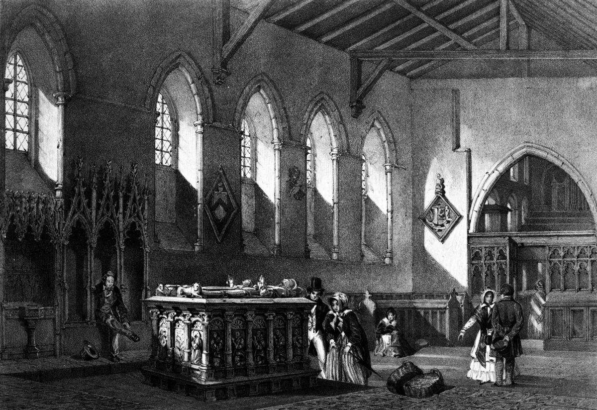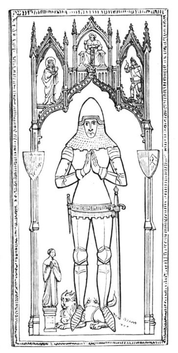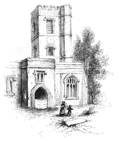 The church of Sawston, which abuts on the park, appears to have been built about the thirteenth century; like most of the churches of Cambridgeshire, it possesses a fine open porch. Sir John Huddleston, who spent the greater part of his fortune in the service of Philip of Spain after Mary’s death, lies buried in the chancel here. The following inscription is engraved on a brass plate placed on the tomb, represented in the annexed woodcut.