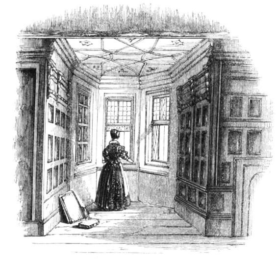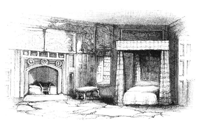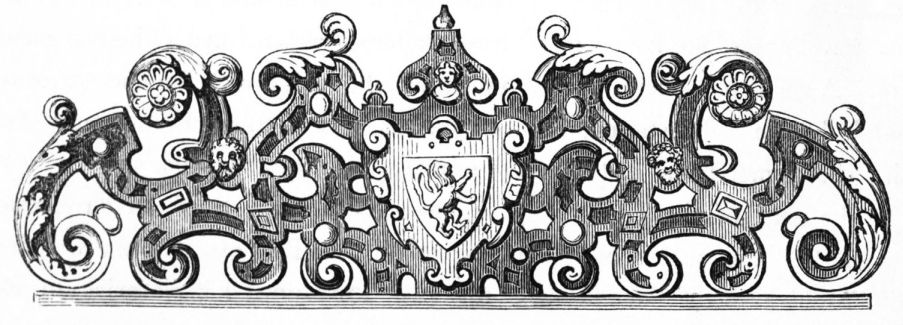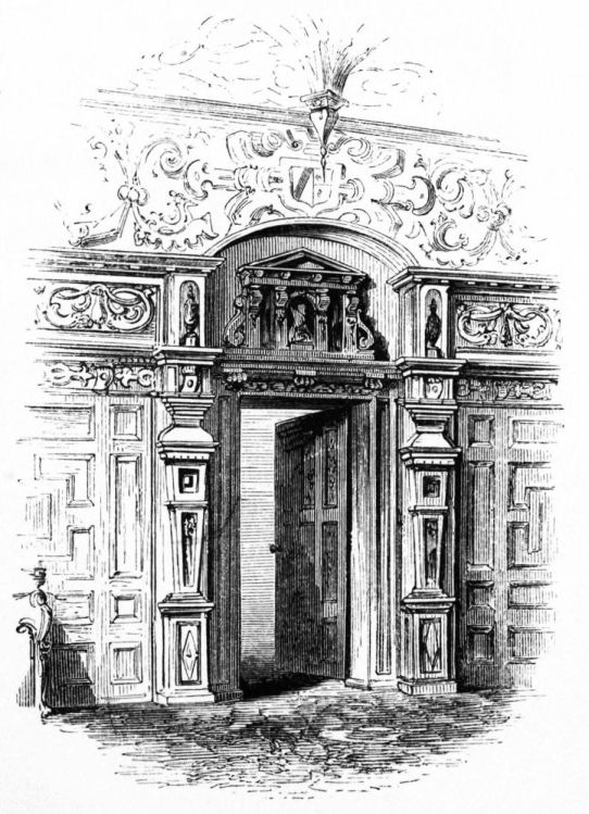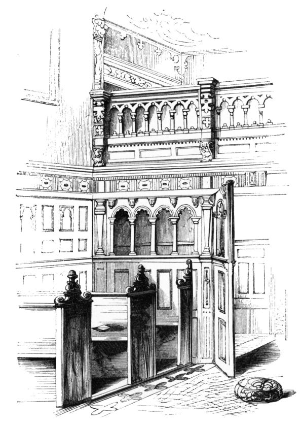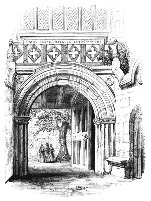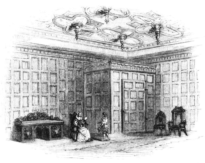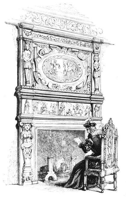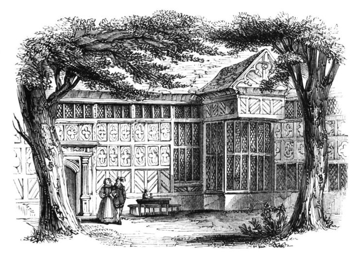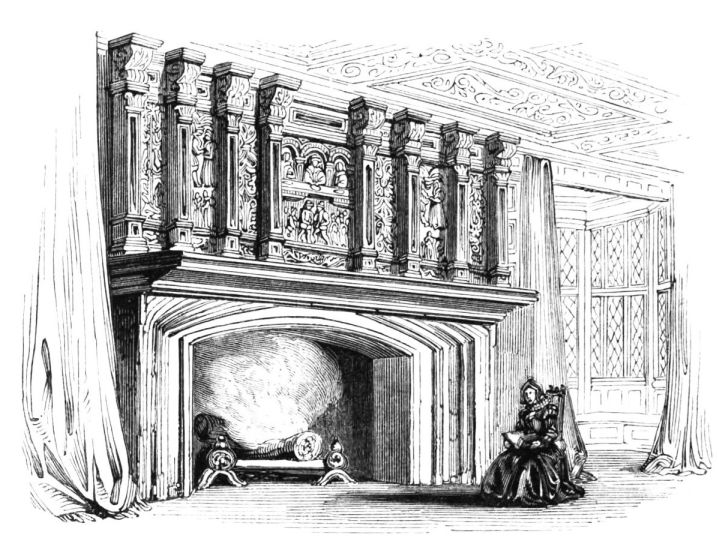On ascending the flight of steps in the entrance-hall, we immediately perceive that modern alterations have greatly effaced the impression of former days with which we had expected to have been greeted. There still remain, however, many notable traces left behind. In a good apartment, opening into the corridor, on the left, is a richly sculptured Chimney-piece, which has been removed from a lodging above, called Queen Elizabeth’s Room. On a panel over the fire-place, bordered with carving, the Brereton{20} Arms were formerly emblazoned in inlaid wood of different colours, upon their ermine mantle, which gave rise to the appellation of Queen Elizabeth’s Fan. The original panel is still in the house, though much dilapidated; but the heraldic achievements have been reproduced by the hands of the painter. The Drawing-room in the south wing has a fine bay window, and retains the old oak wainscoting. The ornamental Chimney-piece in this room is divided by pilasters into three panels, having carved borders, and containing the Brereton Arms. But the chief apartment of the House is in this wing—the spacious and magnificent Dining-room. This noble apartment is rich in the usual armorial decorations. Over the massive architectural Mantel-piece of the period, the pilasters of which reach from the floor to the ceiling, the arms of Queen Elizabeth are fully displayed; the supporters being the golden lion and the red dragon, the latter the cognizance of the Tudor family. The letters E. R. occupy the sides of the royal crest, whilst the words Vivat Regina, and the date, 1585, occur below. The family crest and motto, “Opitulante Deo,” are not omitted. Indeed the armorial bearings richly emblazoned, with various quarterings, are repeated again in the window in stained glass. Around the entire circuit of the room, except over the fire-place, where the vacancy is filled up by a scroll and figures supporting a celestial globe, immediately below the ceiling, there runs a curious series of heraldic achievements in carved oak, now emblazoned afresh. They represent crowns and shields bearing the arms of forty-three different states and principalities; to each of which is attached a scroll, with the name of the King or Emperor in Latin. In the windings of every one of these scrolls there is placed a large white, and also a red rose. The shield of the King of Jerusalem (REX HIERUSALEM) bears an ornamented cross, and his crown is a crown of thorns. It might be difficult to divine the meaning of this display of escutcheons and names. If they were intended to represent the allies of the Queen, or those of her family, allegory seems to have been intimately mingled in the device, from the celestial globe above her head, glittering with golden stars on cerulean blue, to all the subsidiary parts.
