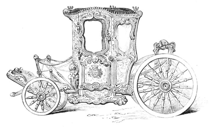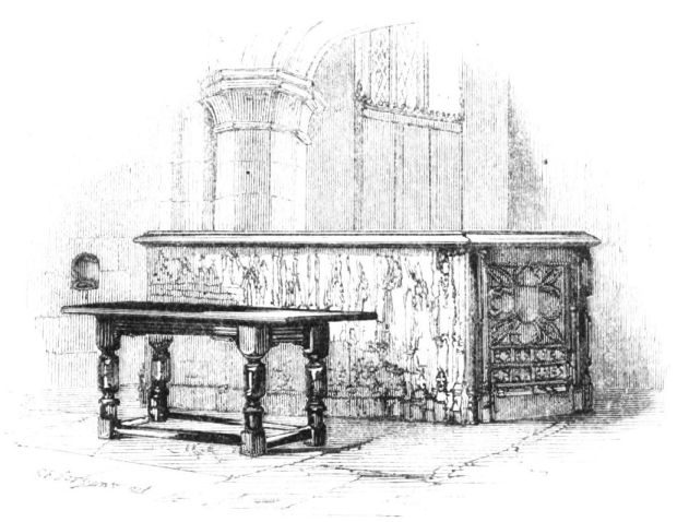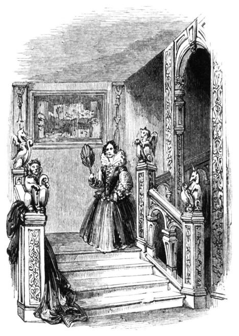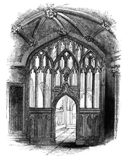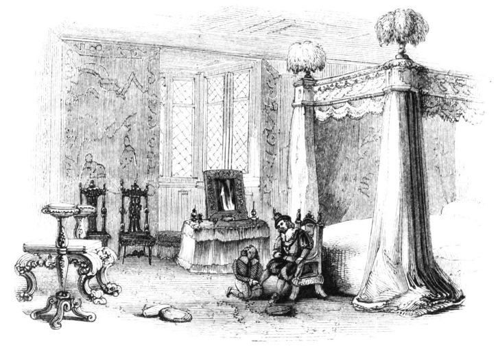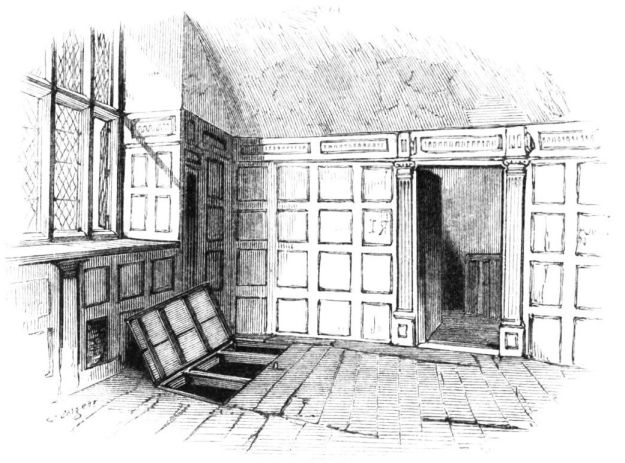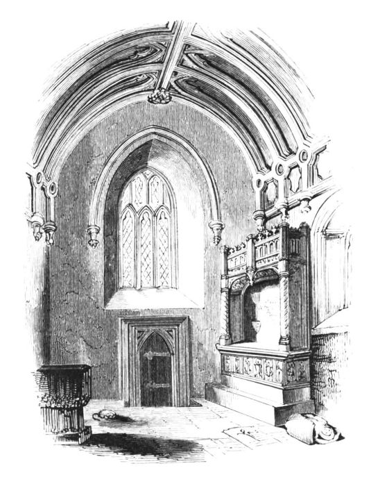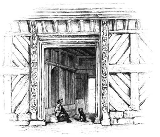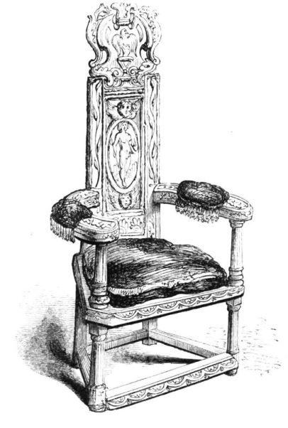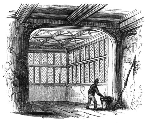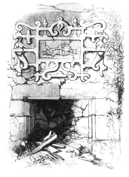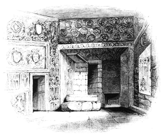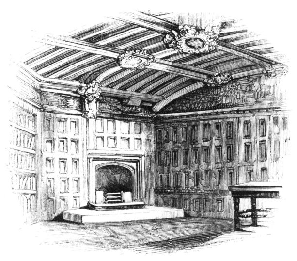 On ascending the flight of steps in the entrance-hall, we immediately perceive that modern alterations have greatly effaced the impression of former days with which we had expected to have been greeted. There still remain, however, many notable traces left behind. In a good apartment, opening into the corridor, on the left, is a richly sculptured Chimney-piece, which has been removed from a lodging above, called Queen Elizabeth’s Room. On a panel over the fire-place, bordered with carving, the Brereton{20} Arms were formerly emblazoned in inlaid wood of different colours, upon their ermine mantle, which gave rise to the appellation of Queen Elizabeth’s Fan. The original panel is still in the house, though much dilapidated; but the heraldic achievements have been reproduced by the hands of the painter. The Drawing-room in the south wing has a fine bay window, and retains the old oak wainscoting. The ornamental Chimney-piece in this room is divided by pilasters into three panels, having carved borders, and containing the Brereton Arms. But the chief apartment of the House is in this wing—the spacious and magnificent Dining-room. This noble apartment is rich in the usual armorial decorations. Over the massive architectural Mantel-piece of the period, the pilasters of which reach from the floor to the ceiling, the arms of Queen Elizabeth are fully displayed; the supporters being the golden lion and the red dragon, the latter the cognizance of the Tudor family. The letters E. R. occupy the sides of the royal crest, whilst the words Vivat Regina, and the date, 1585, occur below. The family crest and motto, “Opitulante Deo,” are not omitted. Indeed the armorial bearings richly emblazoned, with various quarterings, are repeated again in the window in stained glass. Around the entire circuit of the room, except over the fire-place, where the vacancy is filled up by a scroll and figures supporting a celestial globe, immediately below the ceiling, there runs a curious series of heraldic achievements in carved oak, now emblazoned afresh. They represent crowns and shields bearing the arms of forty-three different states and principalities; to each of which is attached a scroll, with the name of the King or Emperor in Latin. In the windings of every one of these scrolls there is placed a large white, and also a red rose. The shield of the King of Jerusalem (REX HIERUSALEM) bears an ornamented cross, and his crown is a crown of thorns. It might be difficult to divine the meaning of this display of escutcheons and names. If they were intended to represent the allies of the Queen, or those of her family, allegory seems to have been intimately mingled in the device, from the celestial globe above her head, glittering with golden stars on cerulean blue, to all the subsidiary parts.