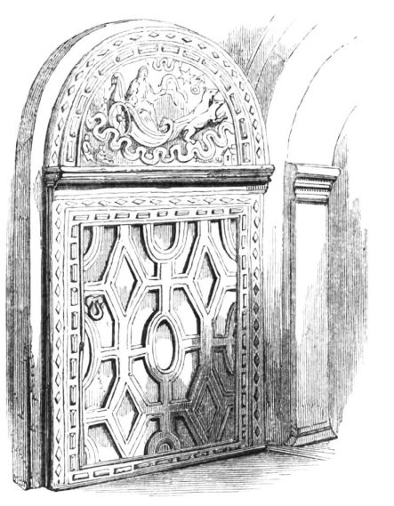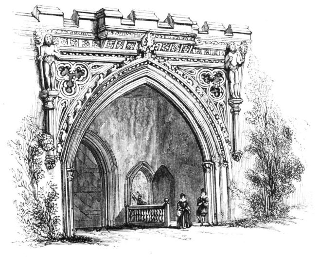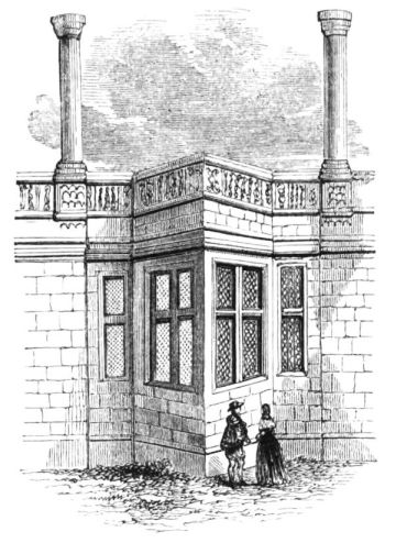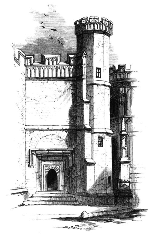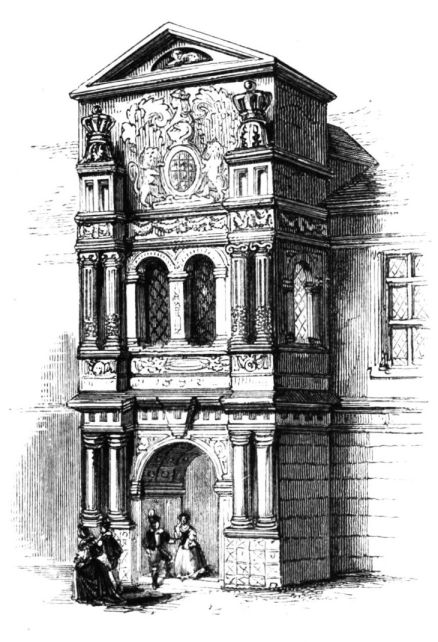 Camden, speaking of Brereton, tell us that Sir William Brereton “added much credit and honour to the place by a magnificent and sumptuous house that he had there built.” The building is of brick, quoined with stone. That Queen Elizabeth laid the first stone of this house, and visited it, at a subsequent period, when hospitality presided in its halls, we have not only the authority of unquestioned tradition, but also that of numerous memorials scattered on its walls. The central portion of its exterior seems to have been especially devoted to ornament, and also to defence. On each side of the door-way, there rises from the ground an octagonal tower or turret, projecting{19} by five of its panes from the wall, and formerly ascending above the building, to terminate in a dome, but now surmounted by a low stone battlement. Immediately over the centre of the door-way the sculptures begin by the shield of the Brereton Arms, bearing two bars sable, being suspended on an ermine mantle, from a helmet supporting the crest—the head of a muzzled bear;—below which is the date 1586. In the spandrels of the elliptical arch of this entrance the arms are repeated with different quarterings, a rose being superadded on each side. We next come to a division, reaching quite across the central part of the front, from the outer side of one turret to that of the other, which is richly adorned. In the first place, it is divided into a number of compartments by a series of short carved pilasters, doubled at every angle of the turrets. Square sculptured stones occupy some of the compartments thus formed. In the middle, however—the place of honour—are the arms of Queen Elizabeth, with the garter, bearing the motto, the crest and supporters, on a tablet of good dimensions. On one side of these is a large rose, on the other a portcullis, both crowned, and both also surmounted by the letters E. R. This ornamental stage of pilasters and sculptures, with the heraldic insignia, is repeated above the square-headed windows, the royal arms again occupying the centre. Each turret has a chalice in high relief on its front pane, below the battlements. But, besides these decorations, so distinctive of the taste of the age in which it was erected, this “stately house of Brereton” bears, in this part, and especially on the different faces of the turrets, and near their tops, to command various angles, as well as different distances, another interesting indication of the days of “good Queen Bess,” happily now grown so unfamiliar to our view. We allude to the numerous large portholes which still frown over the peaceful vale. Above the rise of the roof the turrets are conjoined by a closed gallery, occupied by borders and other decorative sculptures, and supported by a depressed arch of some magnitude. The embattled parapet is continued from the turret on each side, along the front of the house to the gables of the wings, being in the place of an open balustrade, which formerly rose here. Each end of the house is furnished with a large bay, both at the front and the side, which are occupied by windows, and surmounted by a pediment containing sculptured ornaments. The effect of this entire front, over which the gray tint of the masonry prevails, being rich in its antique decorations, is solemn and imposing. Yet it excites, rather than satisfies our curiosity.