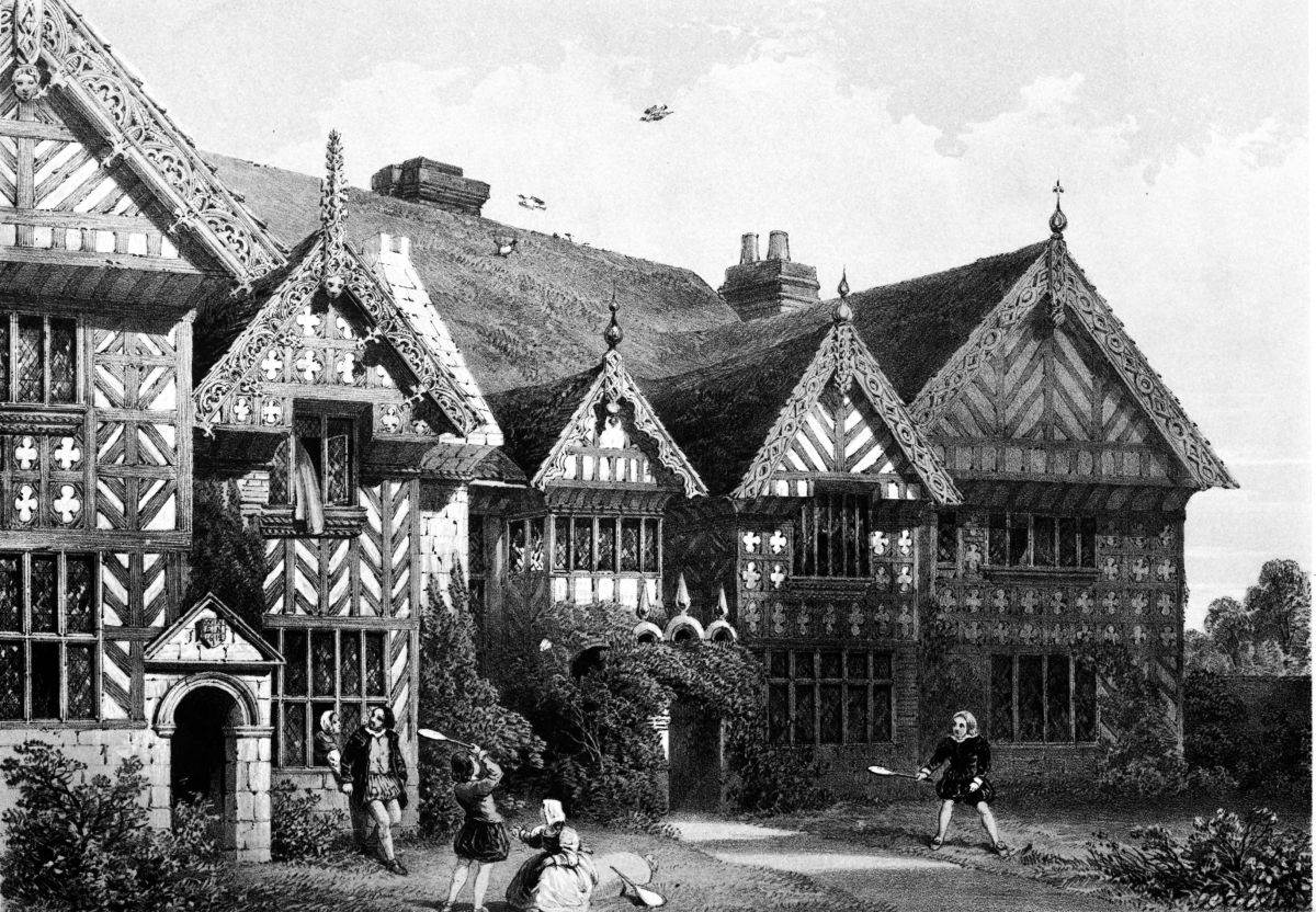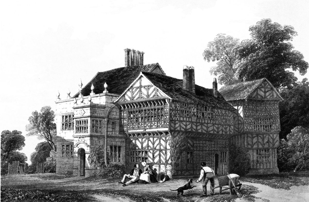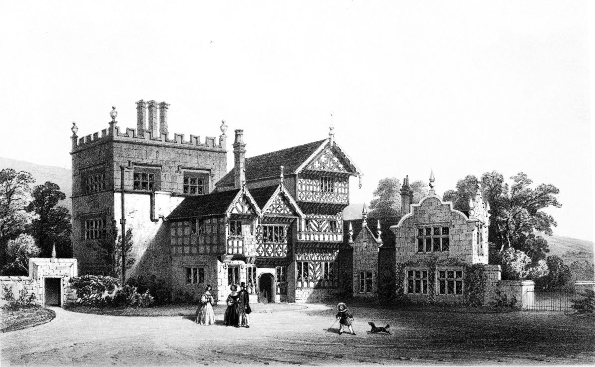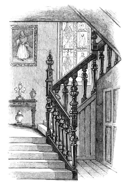 Queen Elizabeth’s room is a good-sized square apartment immediately over the entrance-hall; formerly panelled round the lower part of the walls, but now presenting no evidence of its former high destiny. Other bed-rooms, however, retain their ancient ornamental chimney-pieces, in alabaster and stone, supported and divided by odd-looking pilasters in the Elizabethan style. The oft-repeated Arms of Brereton, painted and sculptured, occur again and again. In a room south of the entrance they are given with supporters, viz., dexter, a greyhound, sinister, a muzzled bear; and each of the panels at the sides bears a coronet, from which is suspended a medal containing a flourished cipher of the name, W. Brereton. In this part of the building some of the old oak floorings remain. A bed-room in the north wing has an alabaster chimney-piece, with the date 1633 on it. In a room in the south wing, formerly{21} the drawing-room, there is an oaken wreath with acorns round the family crest, finely executed in a close-grained stone. A portion of the ancient oaken staircase, leading from the grand dining-room below to this apartment, is still preserved. The landing of this staircase is curious, as exhibiting the former state of the house unchanged. Around the top of the walls, below the ceiling, is painted a long series of escutcheons bearing the arms of various Cheshire families, with the name on a label attached to each. And the window is occupied in its upper part by six compartments, containing the heraldic devices of the five following families, whose names and the dates are inscribed below, (the sixth is vacant,) viz.,—