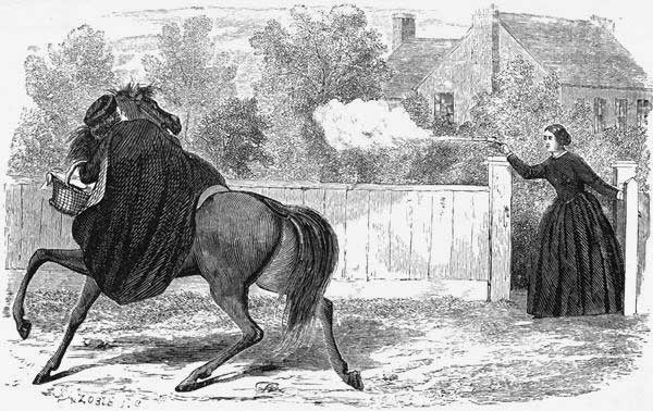 [Pg 380]The day was cold and windy, with a few snow-flakes interspersed, which made the ladies in attendance look very much like “blue noses”; but the blushing bride bore the cold and the admiring glances of the soldiers like a martyr, and retained her dignity and self-possession throughout the ceremony worthy of a heroine, as she was.
