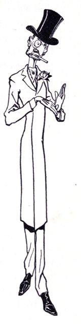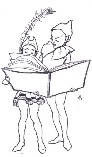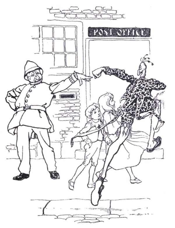 It was the Zankiwank, who was doing some conjuring tricks for the benefit of the Jackarandajam and Mr Swinglebinks, to whom Willie referred. The Zankiwank was certainly a very curious person to look at. He had very long legs, very long arms, and a very small body, a long neck and a head like a peacock. He was not wearing a bathing suit as Willie imagined, because there were tails to his jacket, hanging down almost to his heels. He wore a sash round his waist, and his clothes were all speckled as though he had been peppered with the colours out of a very large kaleidoscope. The Jackarandajam was also rather tall and thin, but dressed in the very height of fashion, with a flower in his coat and a cigarette in his mouth, which he never smoked because he never lit it. He was believed by all the others—you shall know who all the others were presently—to know more things than the Man-in-the-Moon, because he nearly always said something that nobody else ever thought of. And the Man-in-the-Moon knows more things than the Old Woman of Mars. You have naturally heard all about Mars—at least, if you have not heard all about her, you all have heard about her, which is just the same thing, only reversed.