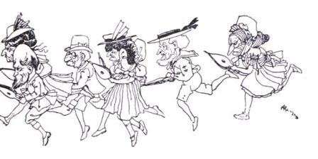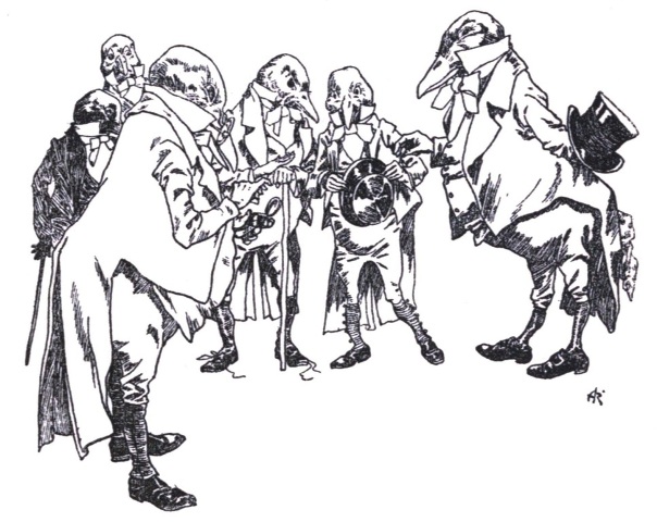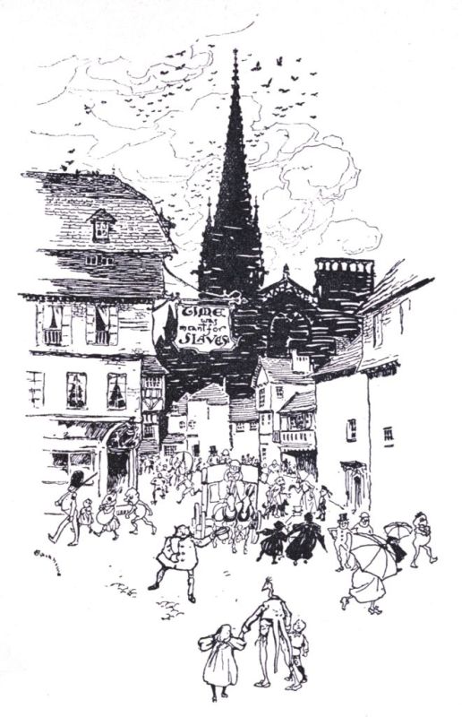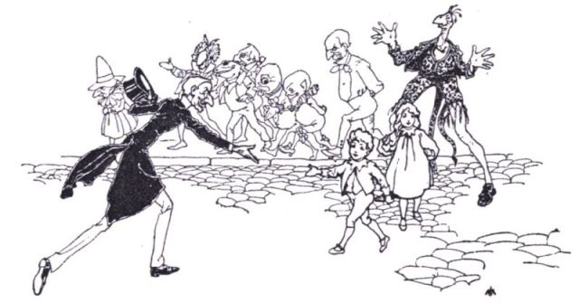 "So!" they all bellowed in chorus, "it is you who have done all this mischief. Come on! We will soon rectify your blunder," and with a swish and a swirl they made one simultaneous movement towards the unfortunate Pampleton, and once again Pandemonium was let loose, when high above the din the voice of the Zankiwank was heard calling upon them to have patience and not to disturb the harmony, as the Bletherwitch had arrived at last. Meanwhile everybody rushed madly down the street after the Court Physician.