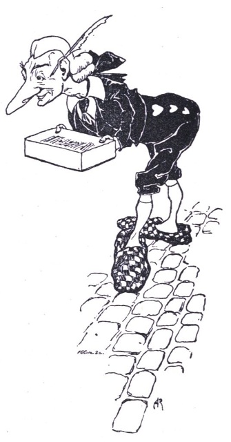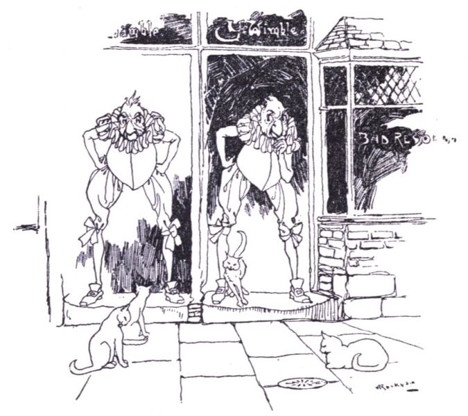 They repeated their dance and then knocked at the door of the nearest house and begged pantomimically for money, but as it was washing day they were refused. So they went into the cook shop and had some Irish Stew, which did not agree with them. Consequently they sprang into the hash that was simmering on the fire, and were seen no more. Whereupon the Zankiwank looked gooseberrily out of his eyes and murmured as if nothing out of the way or in the way had happened, or the Phœnix or the Griffin had existed—"The Bletherwitch will send me a telegram to say that she will be ready for the ceremony in half-an-hour."
