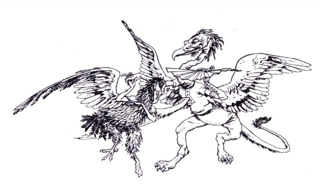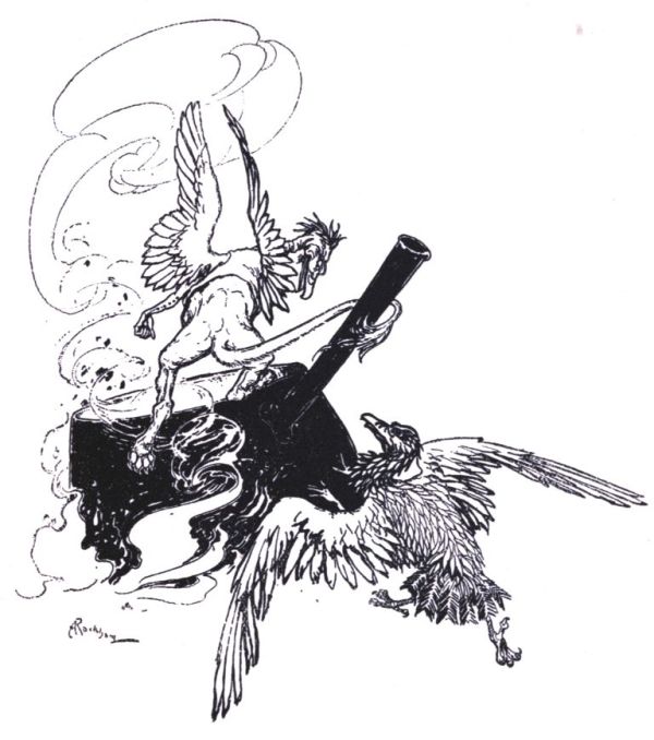 A dark shadow enveloped the square in which they were standing; then there was a weird perfume of damp fireworks and saltpetre, and before any one could say Guy Fawkes, the Phœnix rose from his own funeral pyre of faded frankincense, mildewed myrrh, and similar luxuries, and flapped his wings vigorously, just as the Griffin jumped off his pedestal, which he had brought with him, and piped out—