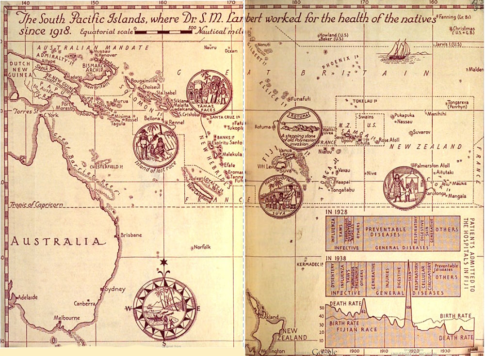 I was just an item in the Rockefeller Foundation’s globe-circling humanitarianism. Dr. Victor Heiser gave me my first job in the South Pacific; Dr. Sawyer, now Director for the International Health Division, turned the tide for me when my favorite plan seemed about to fail. With Dr. Heiser I have tramped over Fiji and Samoa, agreeing or disagreeing on various questions of tropical health. Once or twice he turned to me and asked, “Lambert, why don’t you write a book?”
