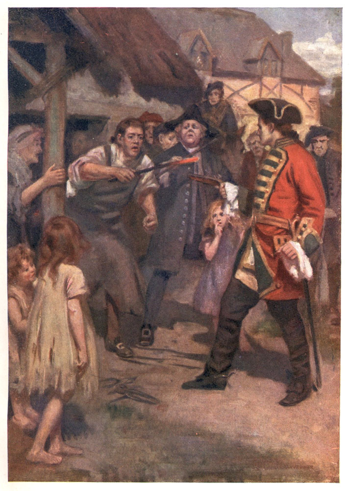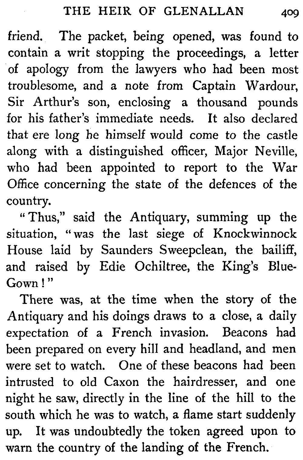 It was all that Oldbuck, with his best tact and wisdom, could do to keep Hector MacIntyre from assaulting the officers of the law during the absence of Edie. Two long hours they waited. The carriage had already been ordered round to the door to convey Sir Arthur to prison. Miss Wardour was in agony, her father desperate with shame and grief, when Edie arrived triumphantly grasping a packet. He delivered it forthwith to the Antiquary. For Sir Arthur, knowing his own weakness, had put himself unreservedly into the hands of his abler[409] friend. The packet, being opened, was found to contain a writ stopping the proceedings, a letter of apology from the lawyers who had been most troublesome, and a note from Captain Wardour, Sir Arthur's son, enclosing a thousand pounds for his father's immediate needs. It also declared that ere long he himself would come to the castle along with a distinguished officer, Major Neville, who had been appointed to report to the War Office concerning the state of the defences of the country.