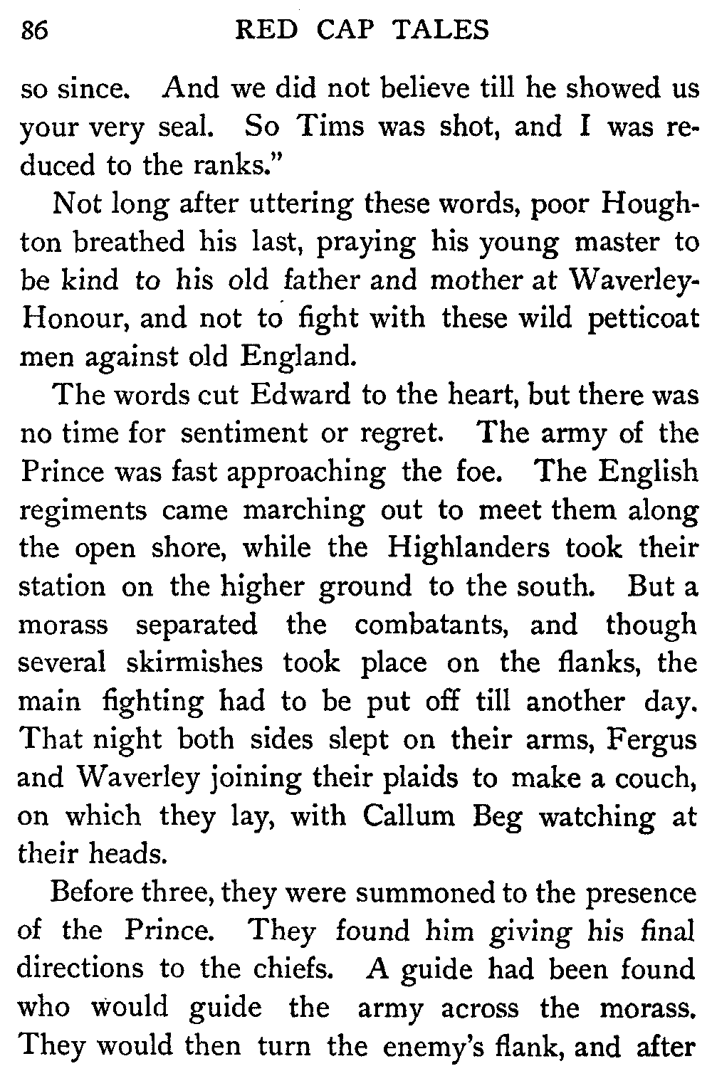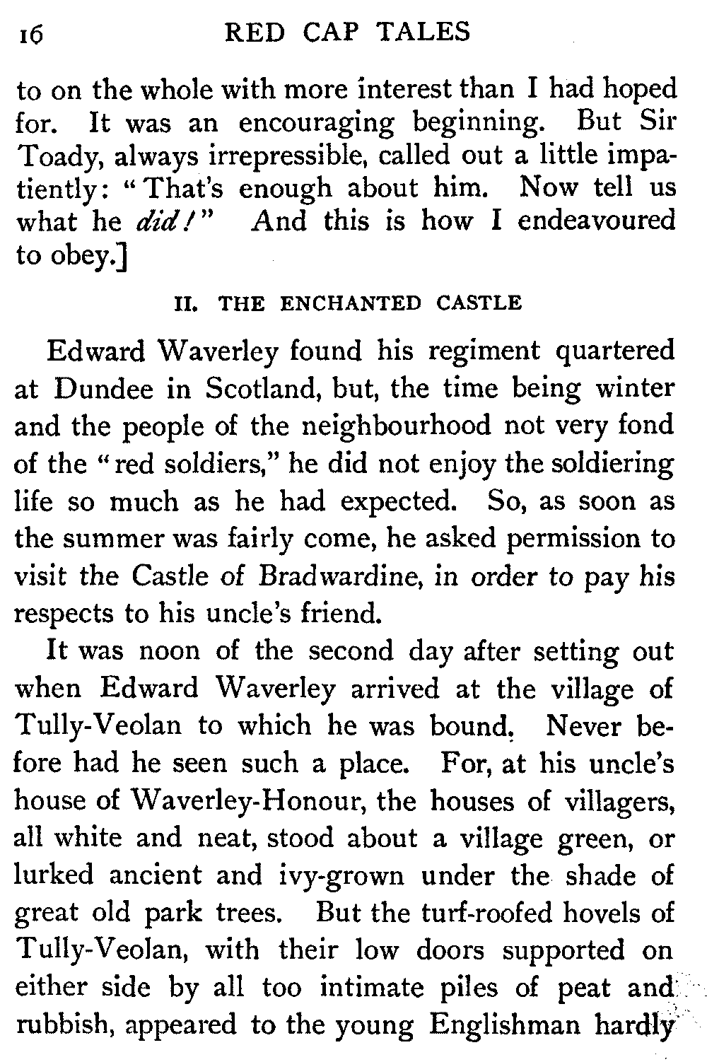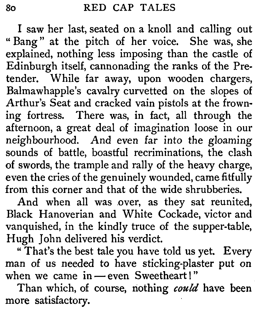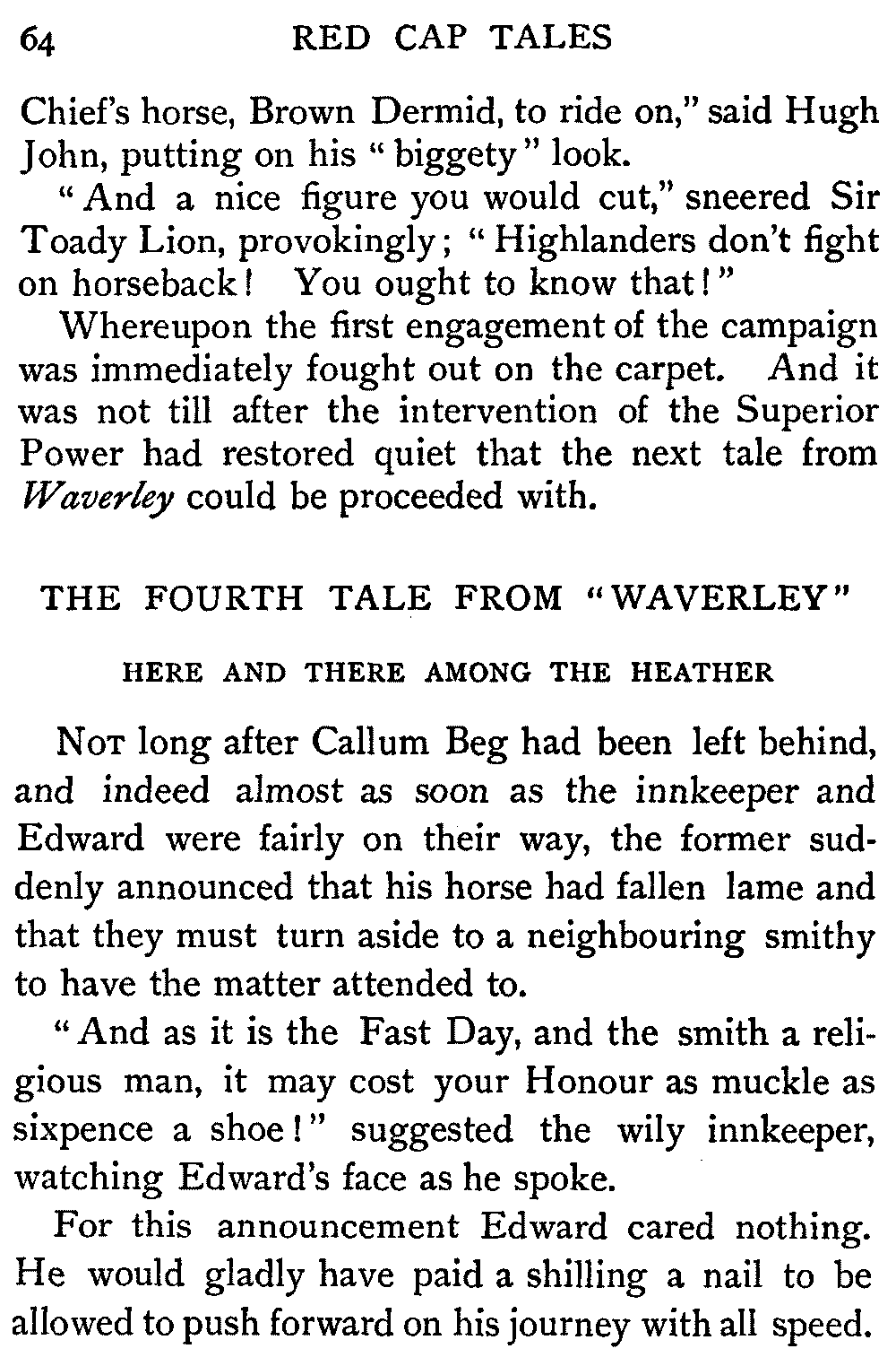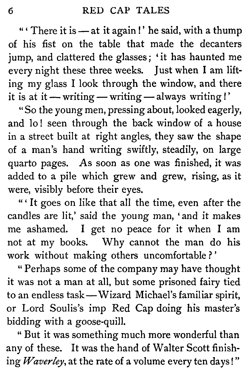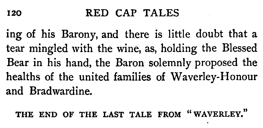 Now, since the first telling of these Red Cap Tales, the Scott shelf in the library has been taken by storm and escalade. It is permanently gap-toothed all along the line. Also there are nightly skirmishes, even to the laying on of hands, as to who shall sleep with Waverley under his pillow.