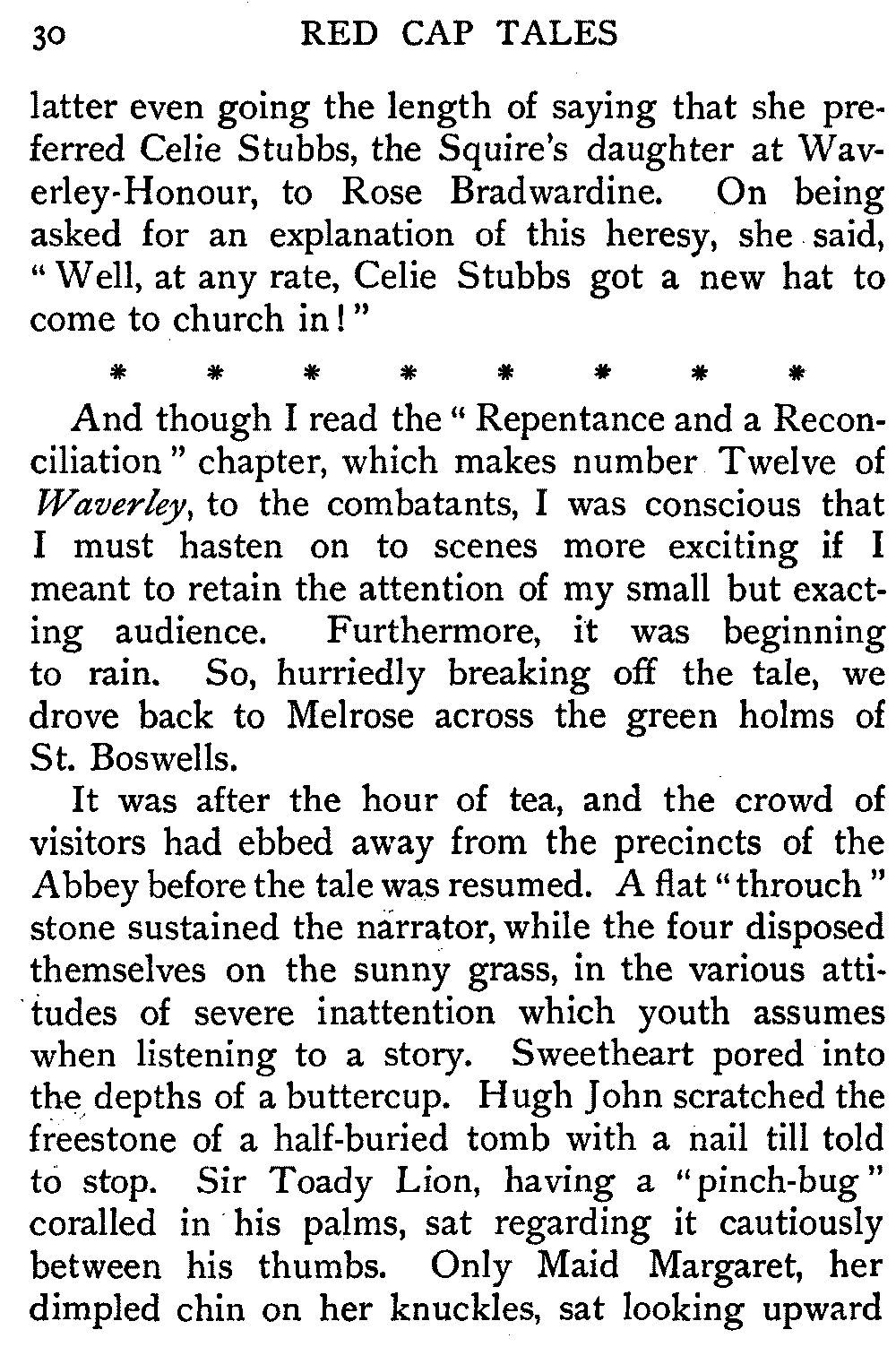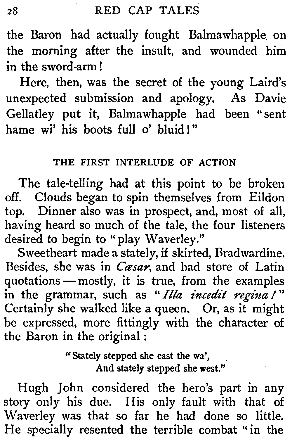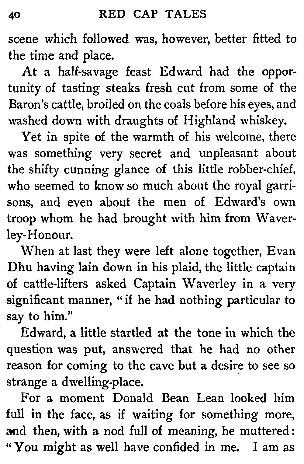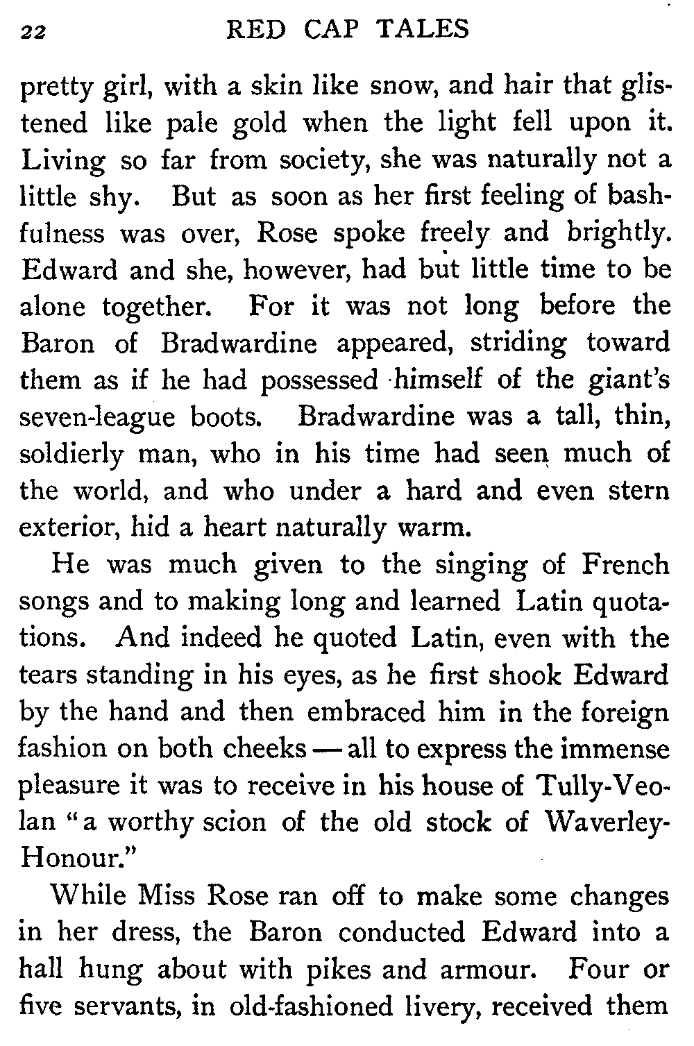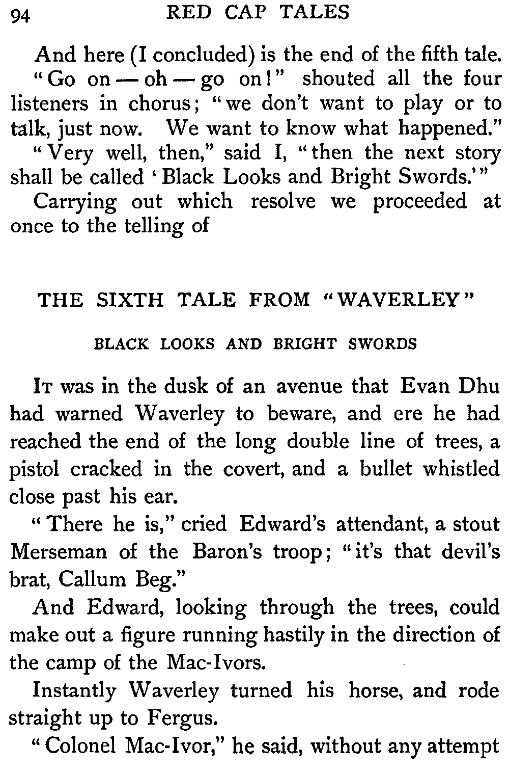 Now, since the first telling of these Red Cap Tales, the Scott shelf in the library has been taken by storm and escalade. It is permanently gap-toothed all along the line. Also there are nightly skirmishes, even to the laying on of hands, as to who shall sleep with Waverley under his pillow.