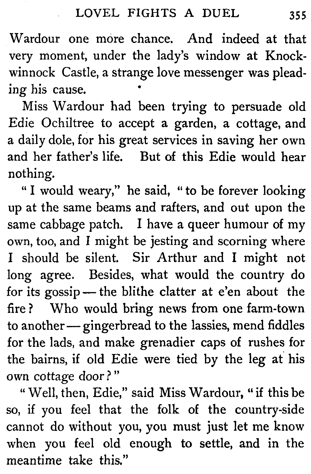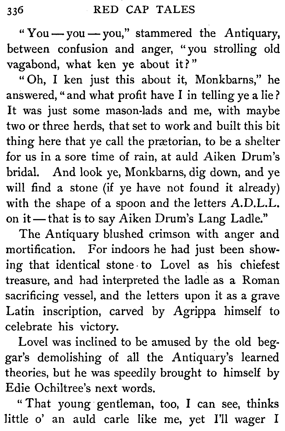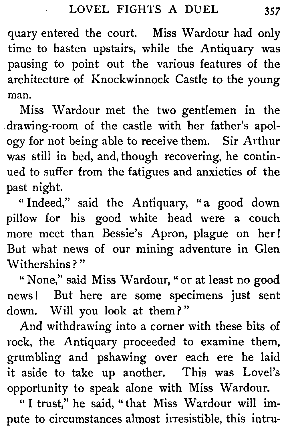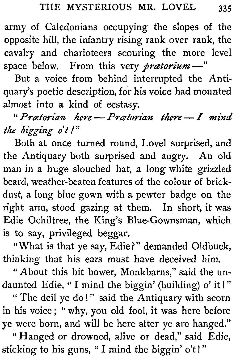 "Thus," said the Antiquary, summing up the situation, "was the last siege of Knockwinnock House laid by Saunders Sweepclean, the bailiff, and raised by Edie Ochiltree, the King's Blue-Gown!"