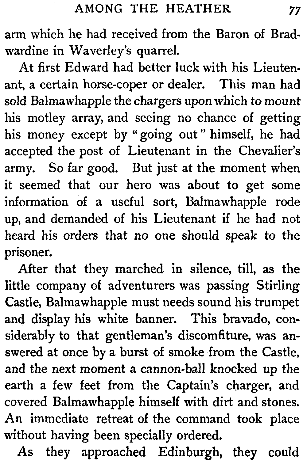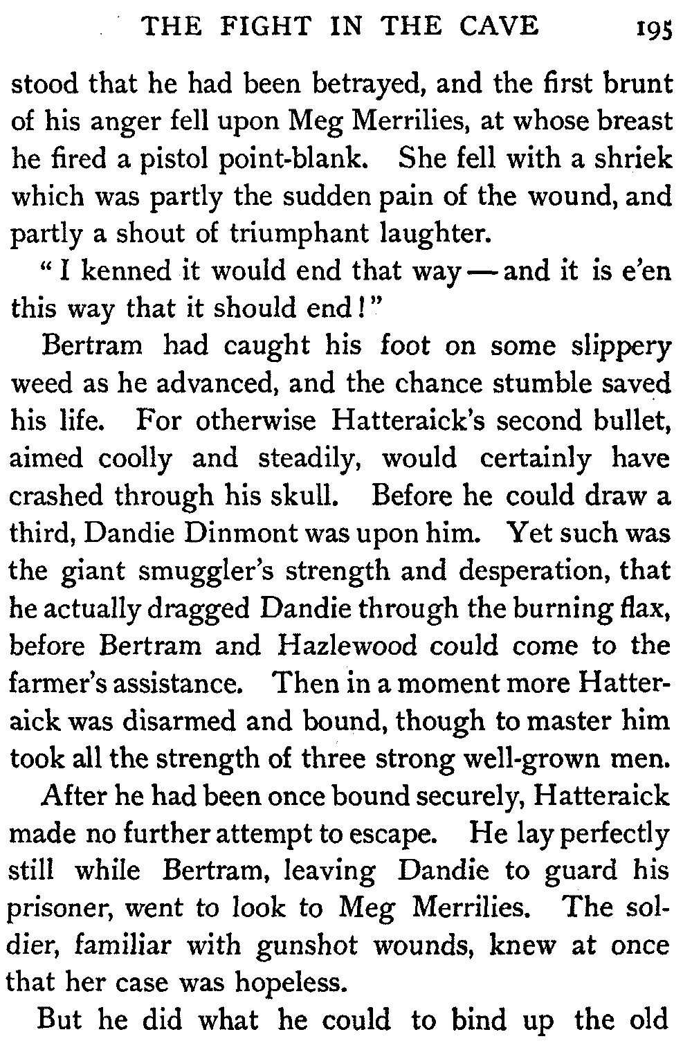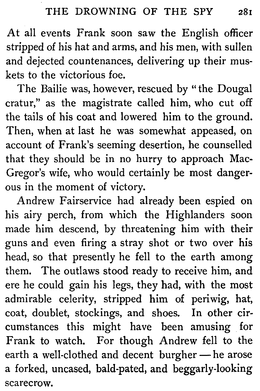 "Thus," said the Antiquary, summing up the situation, "was the last siege of Knockwinnock House laid by Saunders Sweepclean, the bailiff, and raised by Edie Ochiltree, the King's Blue-Gown!"