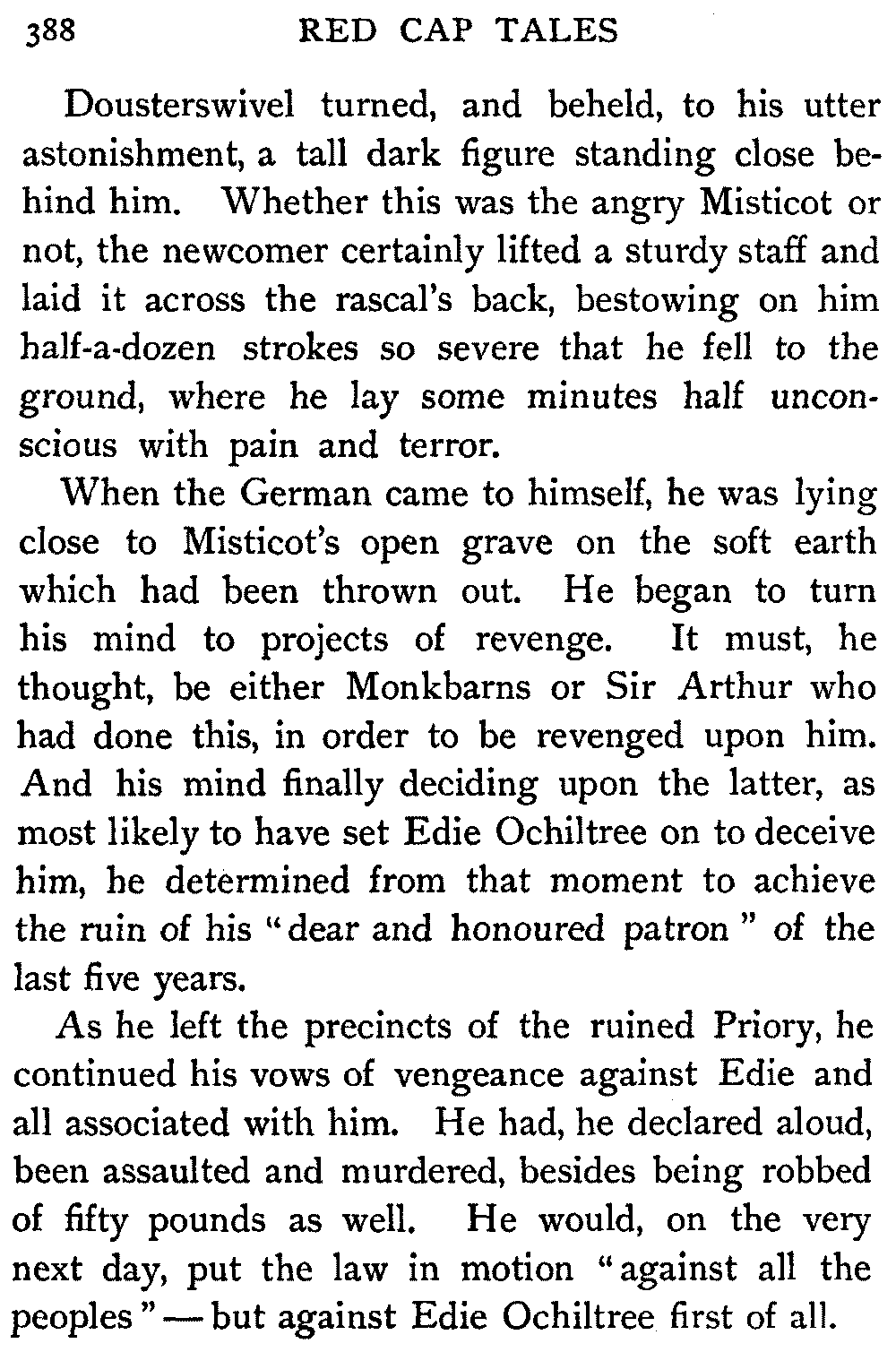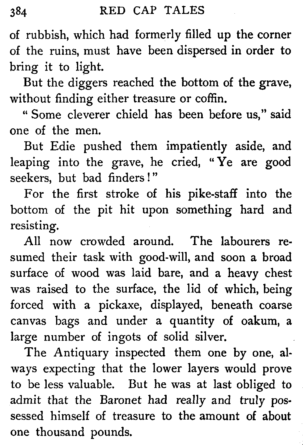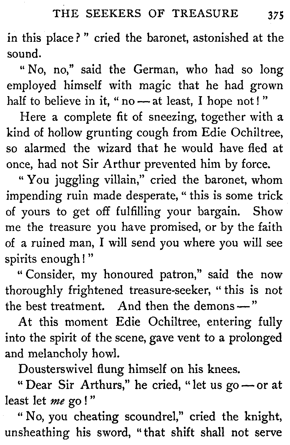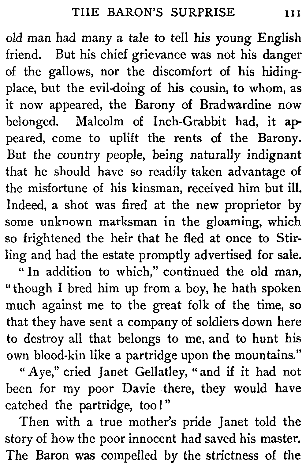 "Thus," said the Antiquary, summing up the situation, "was the last siege of Knockwinnock House laid by Saunders Sweepclean, the bailiff, and raised by Edie Ochiltree, the King's Blue-Gown!"