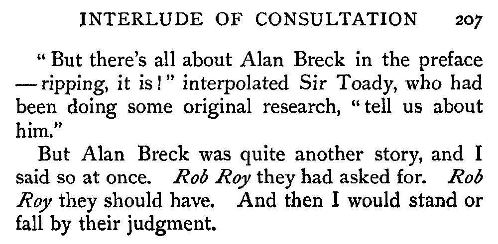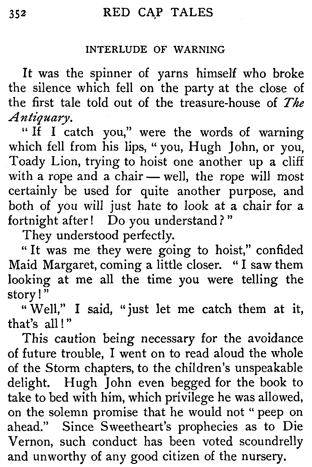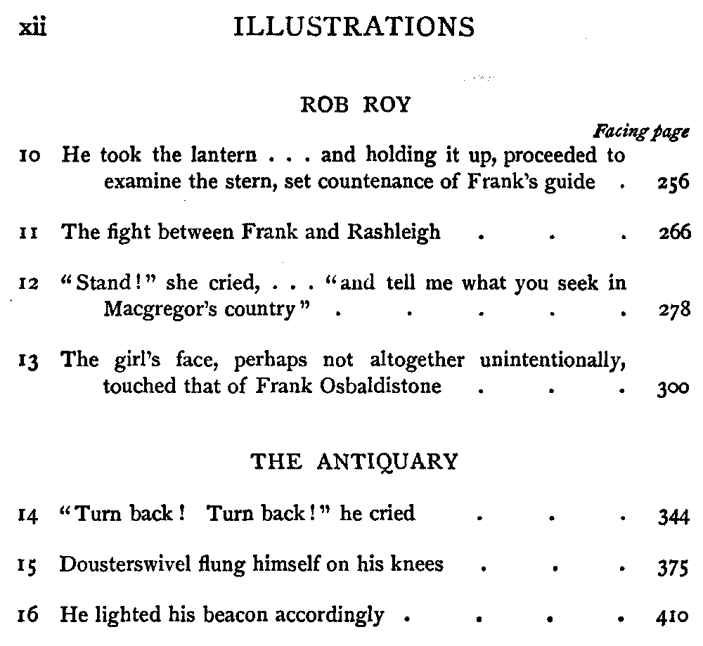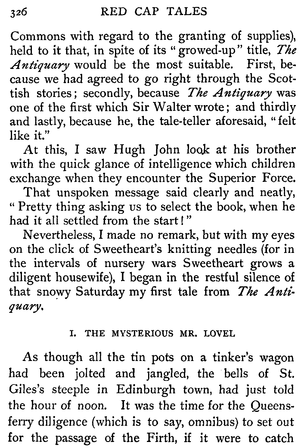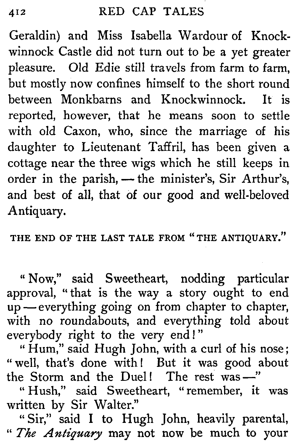 "Sir," said I to Hugh John, heavily parental, "The Antiquary may not now be much to your[413] taste, but the day will come when you may probably prefer it to all the rest put together."