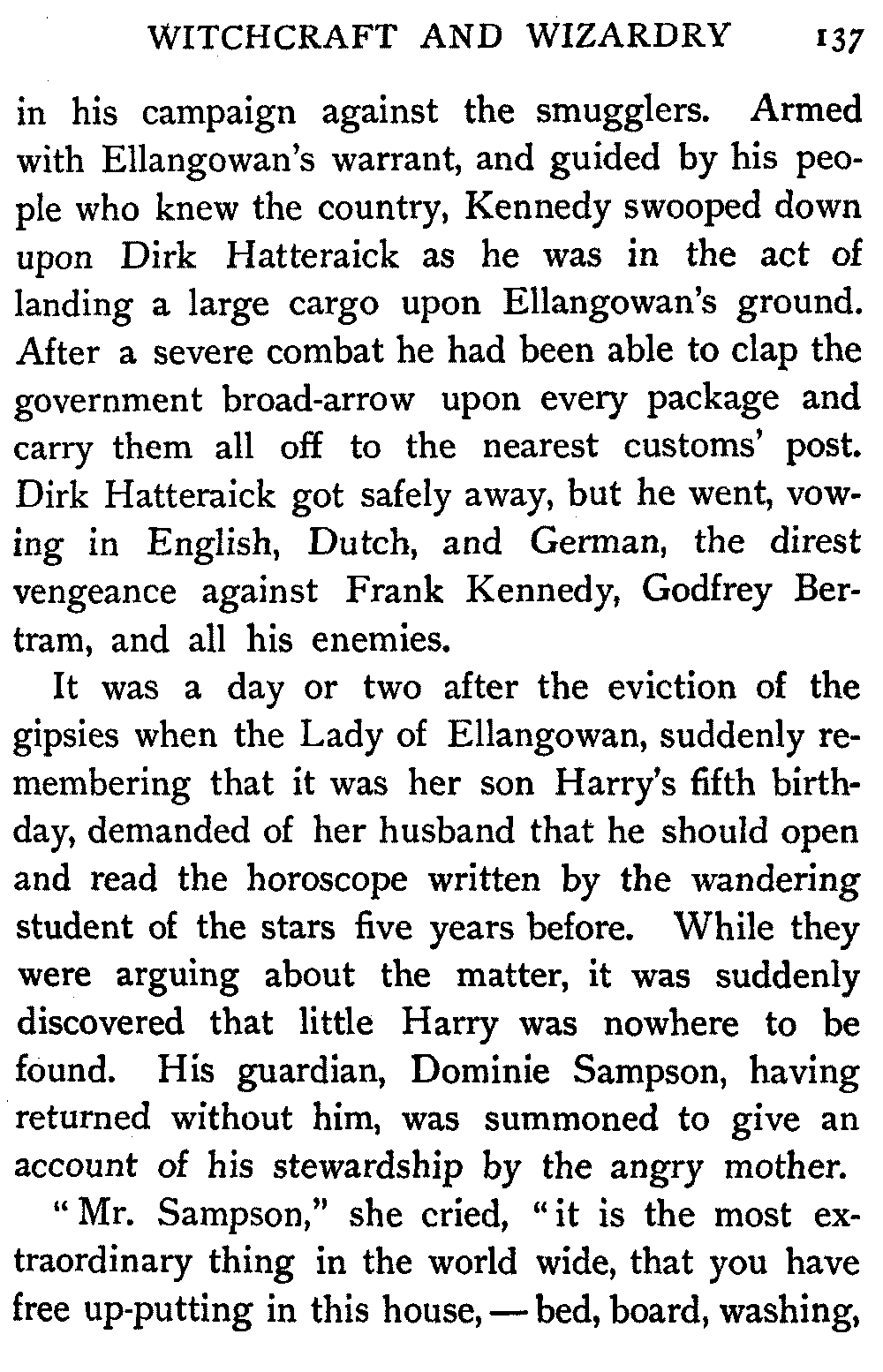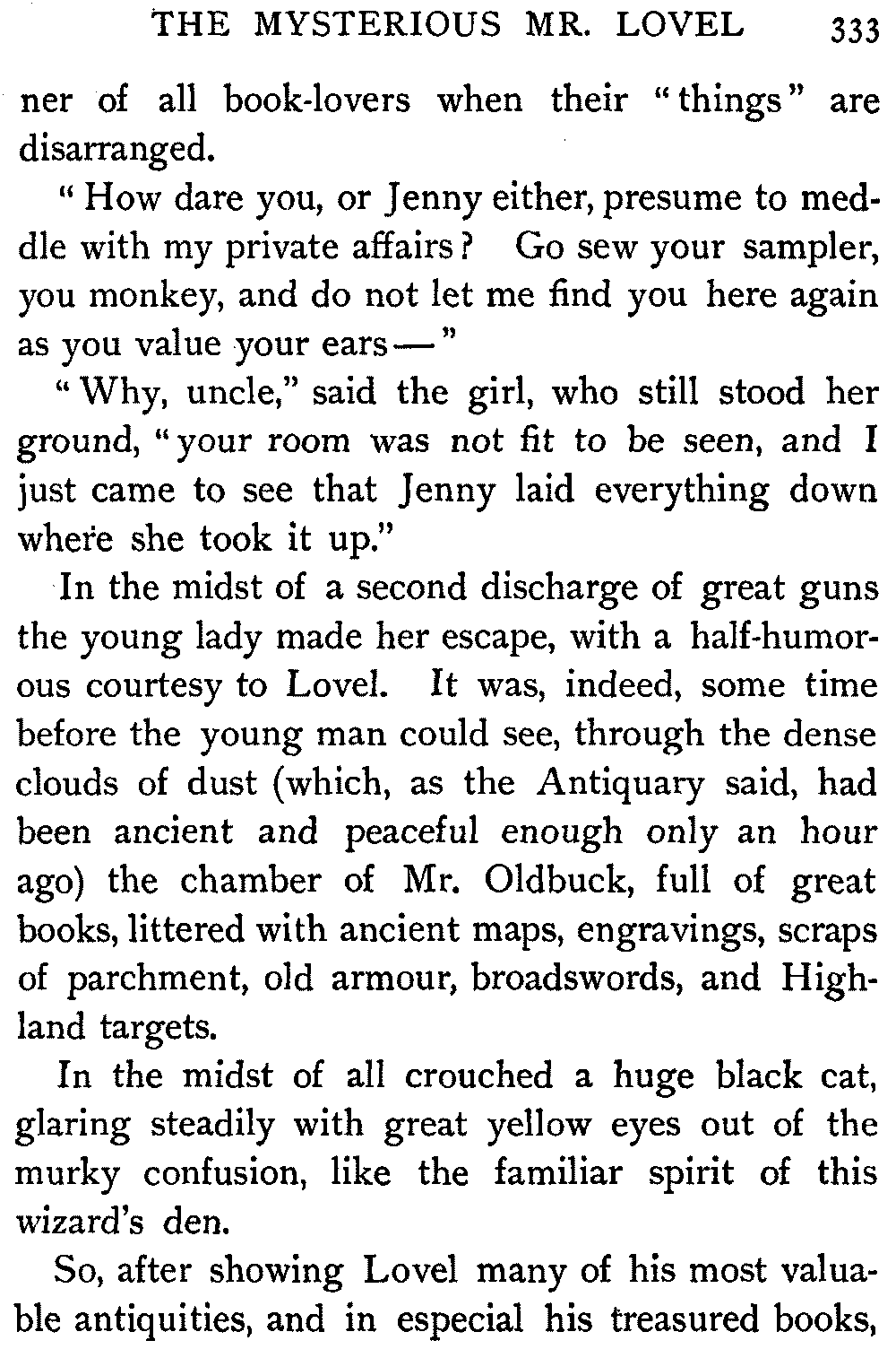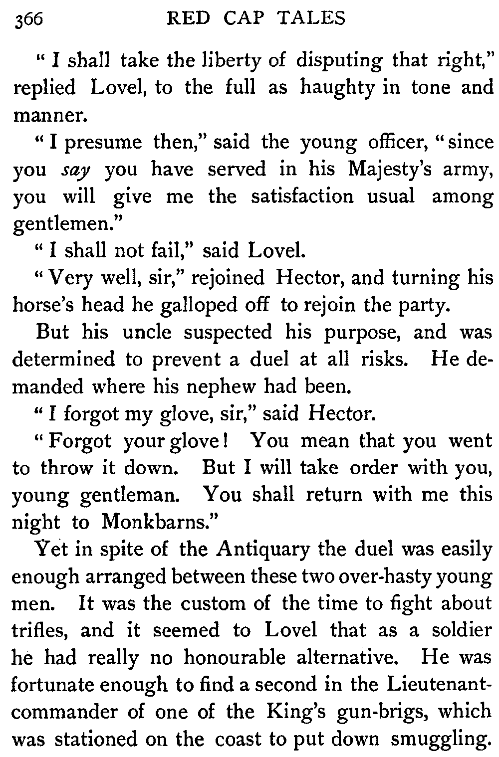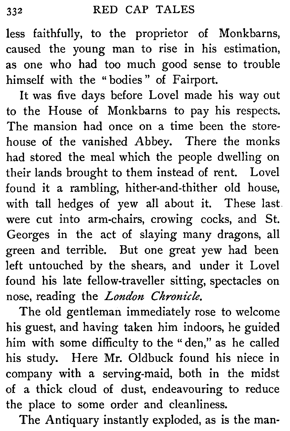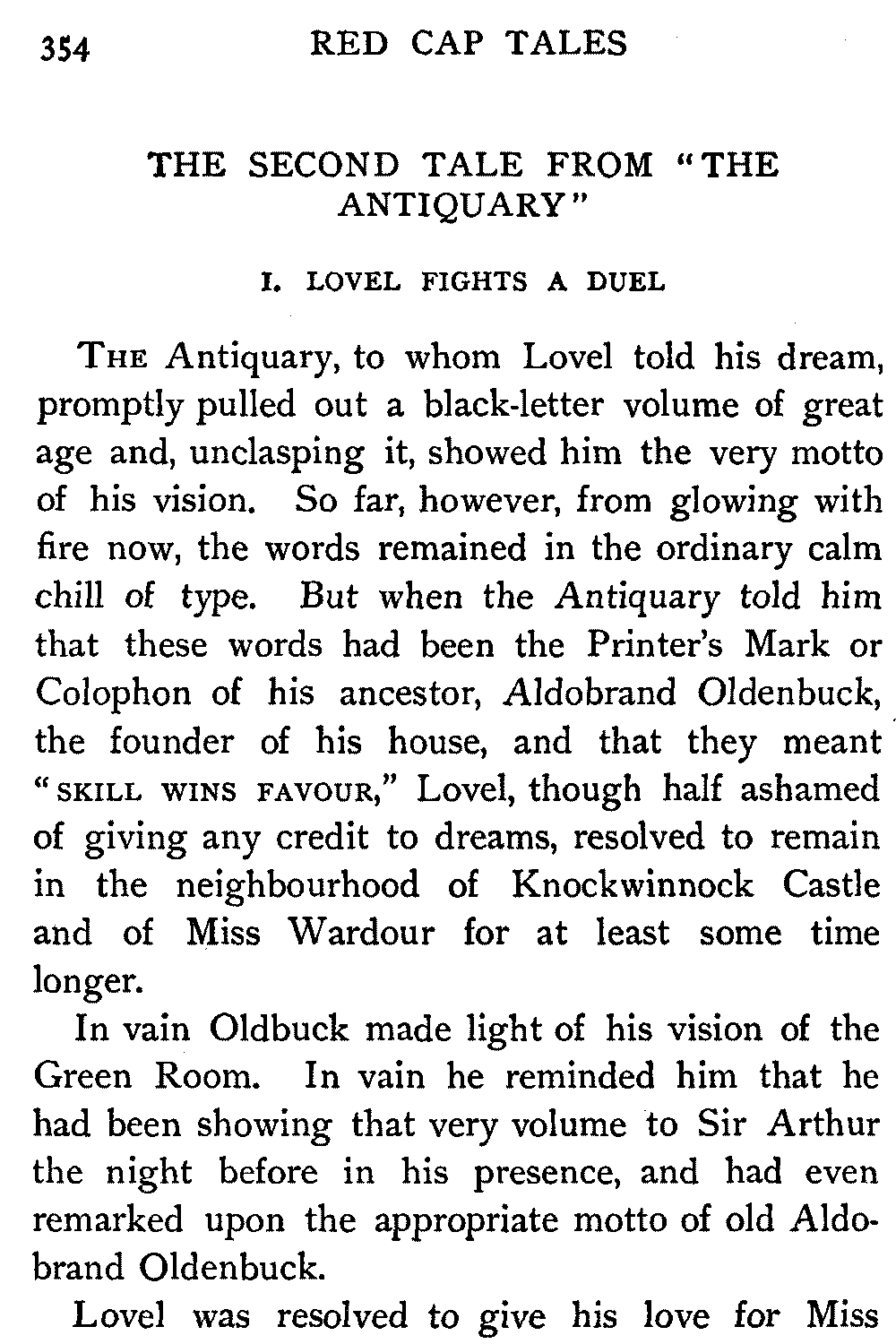 "Sir," said I to Hugh John, heavily parental, "The Antiquary may not now be much to your[413] taste, but the day will come when you may probably prefer it to all the rest put together."
