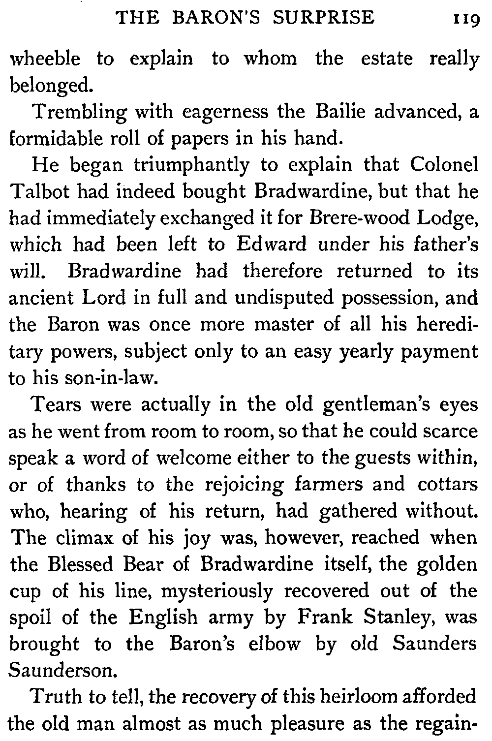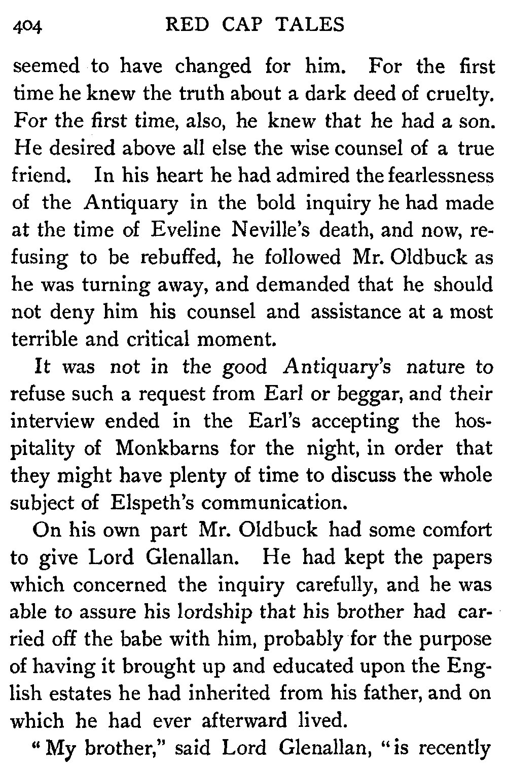 On his own part Mr. Oldbuck had some comfort to give Lord Glenallan. He had kept the papers which concerned the inquiry carefully, and he was able to assure his lordship that his brother had carried off the babe with him, probably for the purpose of having it brought up and educated upon the English estates he had inherited from his father, and on which he had ever afterward lived.