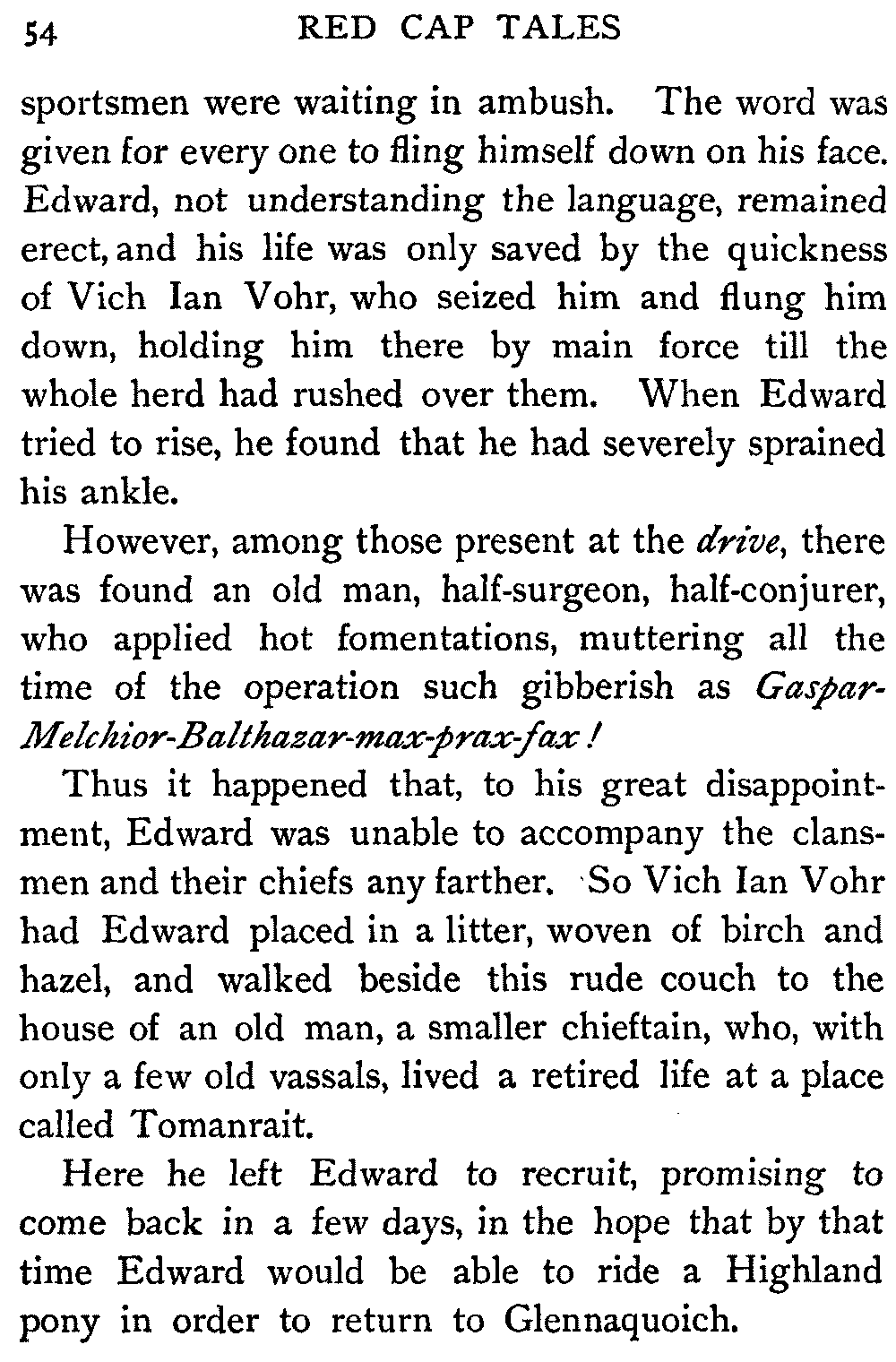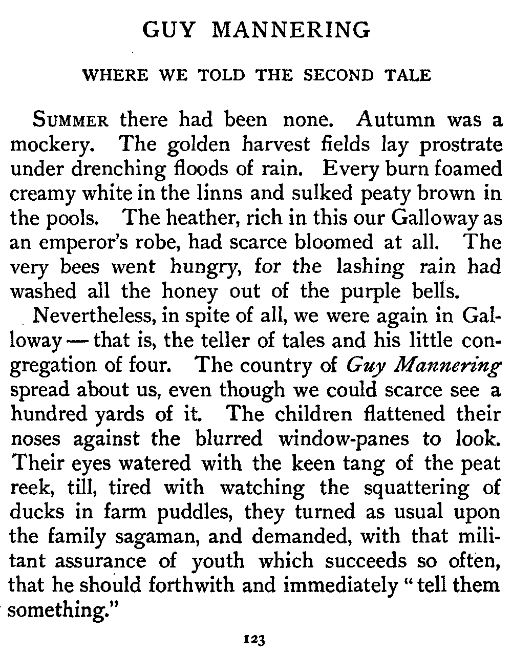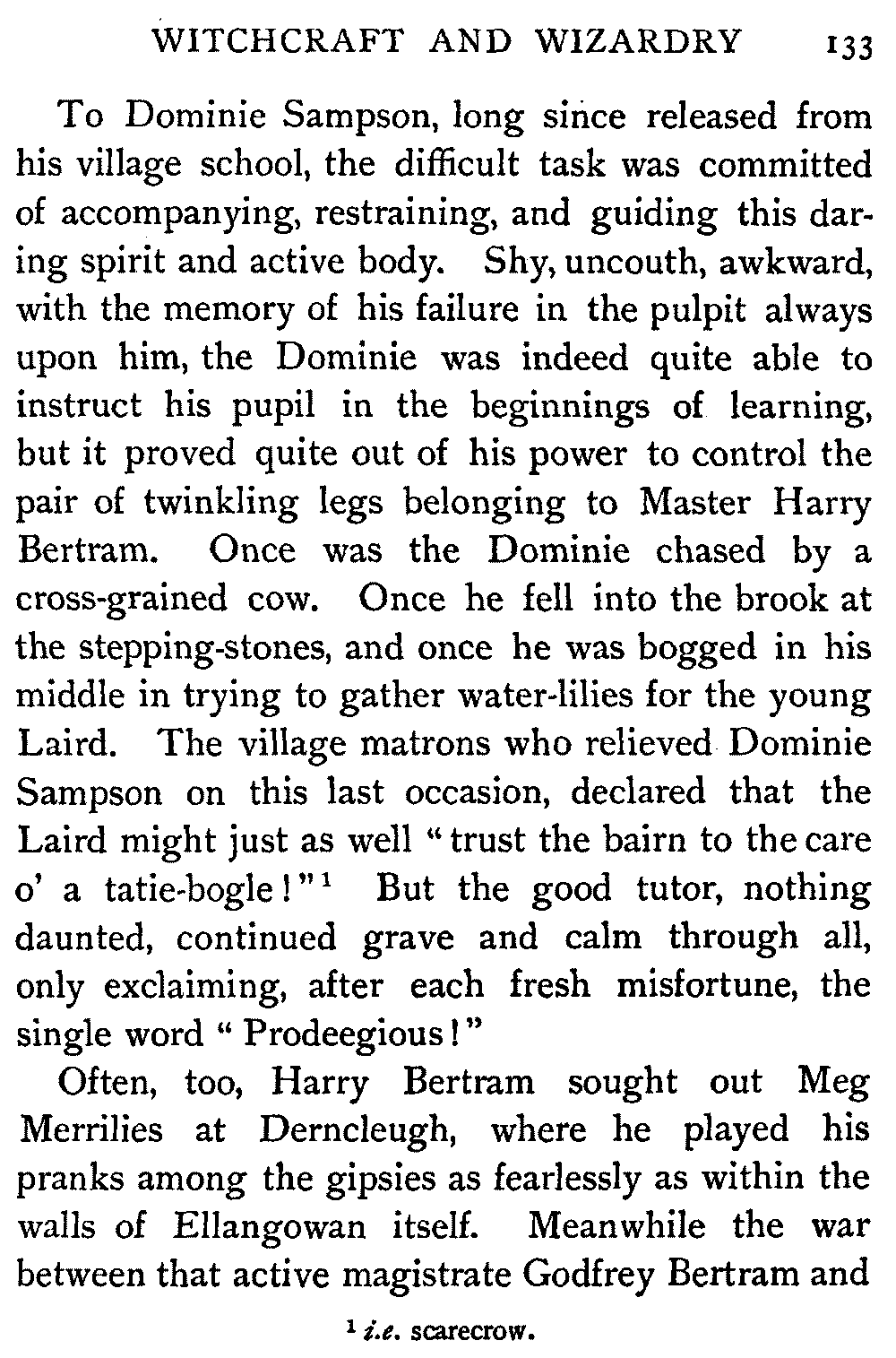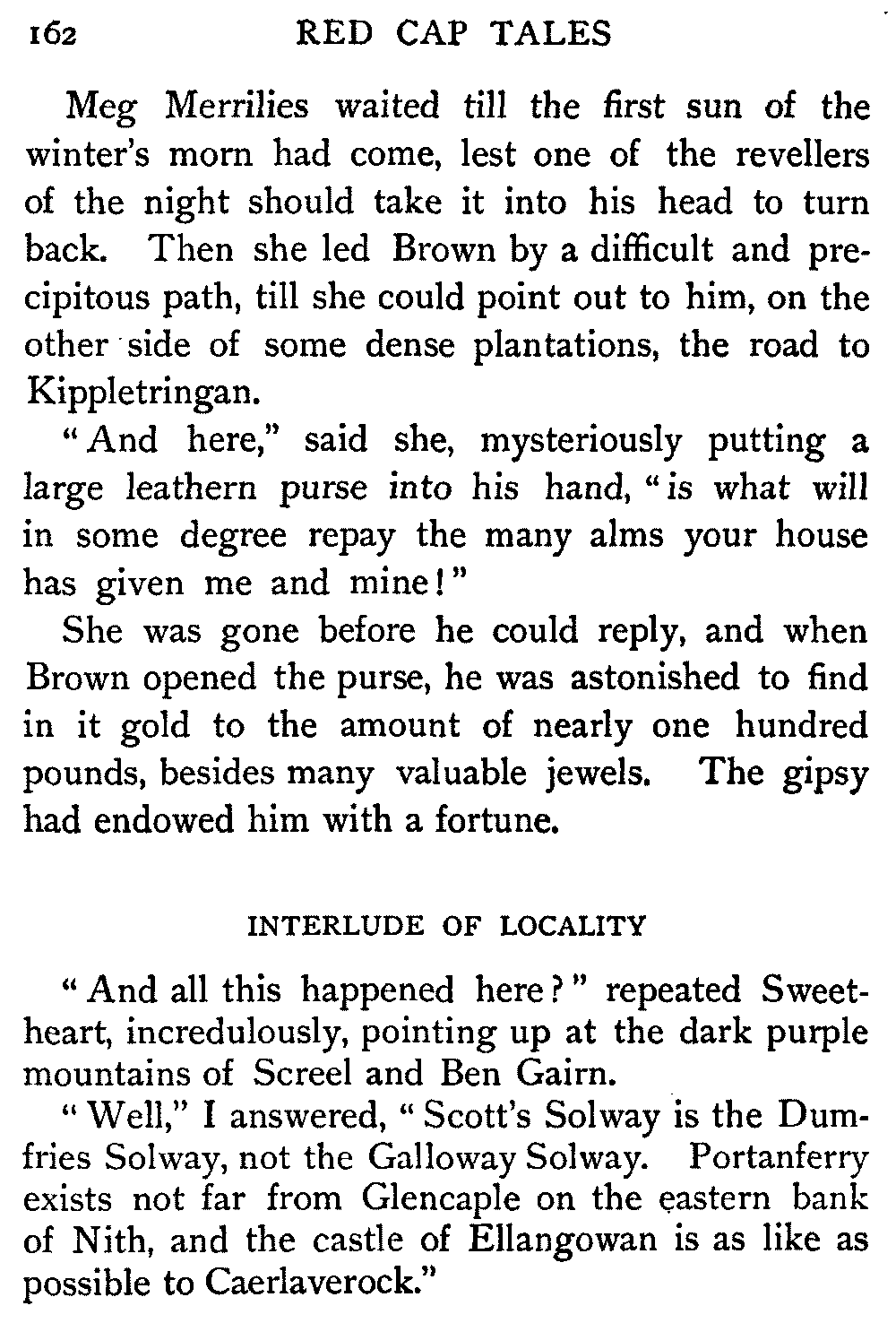 [1] These were Scottish children to whom the stories were retold, and they understood the Scottish tongue. So the dialect parts were originally told in that speech. Now, however, in pity for children who have the misfortune to inherit only English, I have translated all the hard words and phrases as best I could. But the old is infinitely better, and my only hope and aim is, that the retelling of these stories by the living voice may send every reader, every listener, to the Master of Romance himself. If I succeed in this, my tale-telling shall not have been in vain.