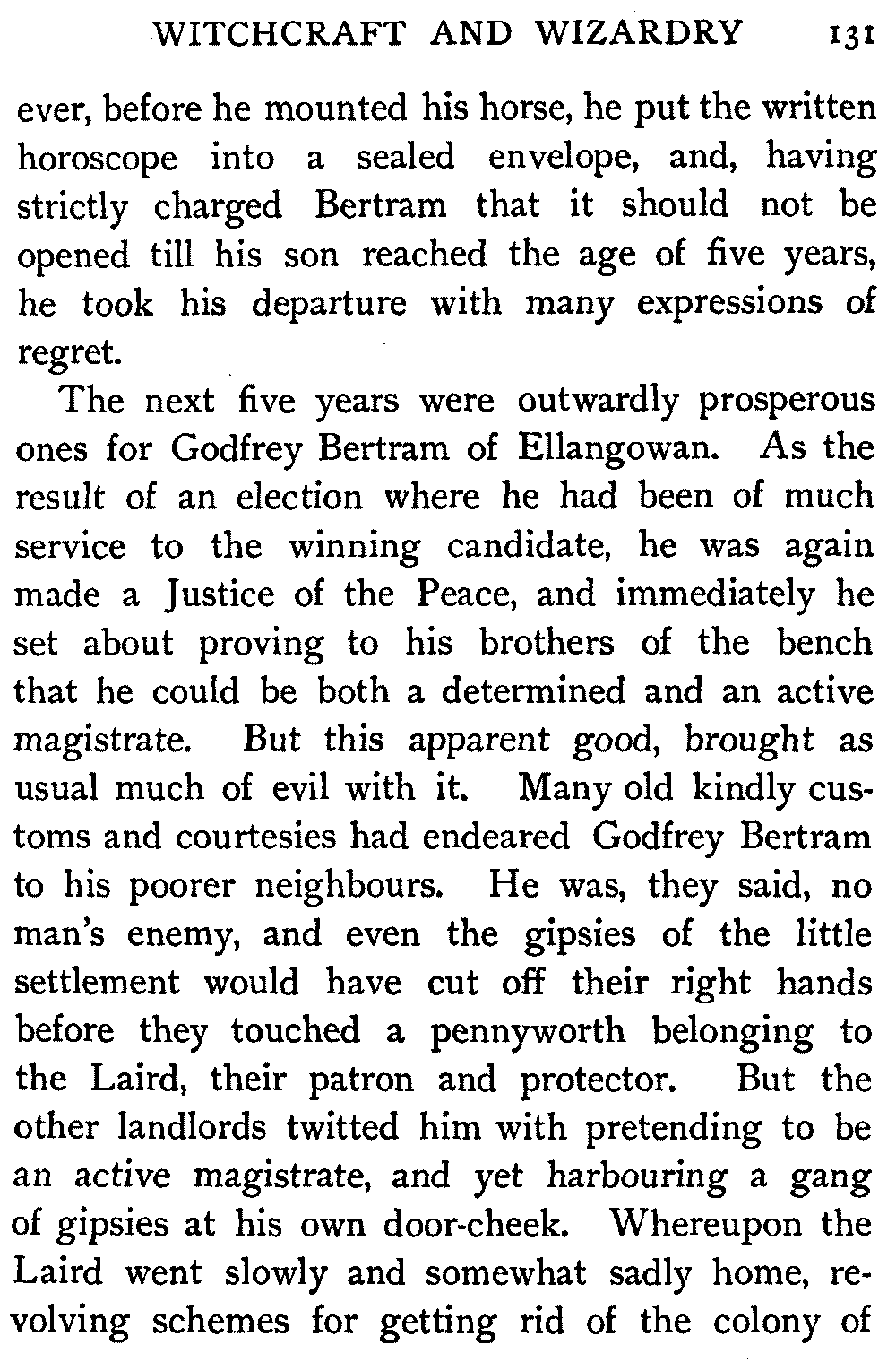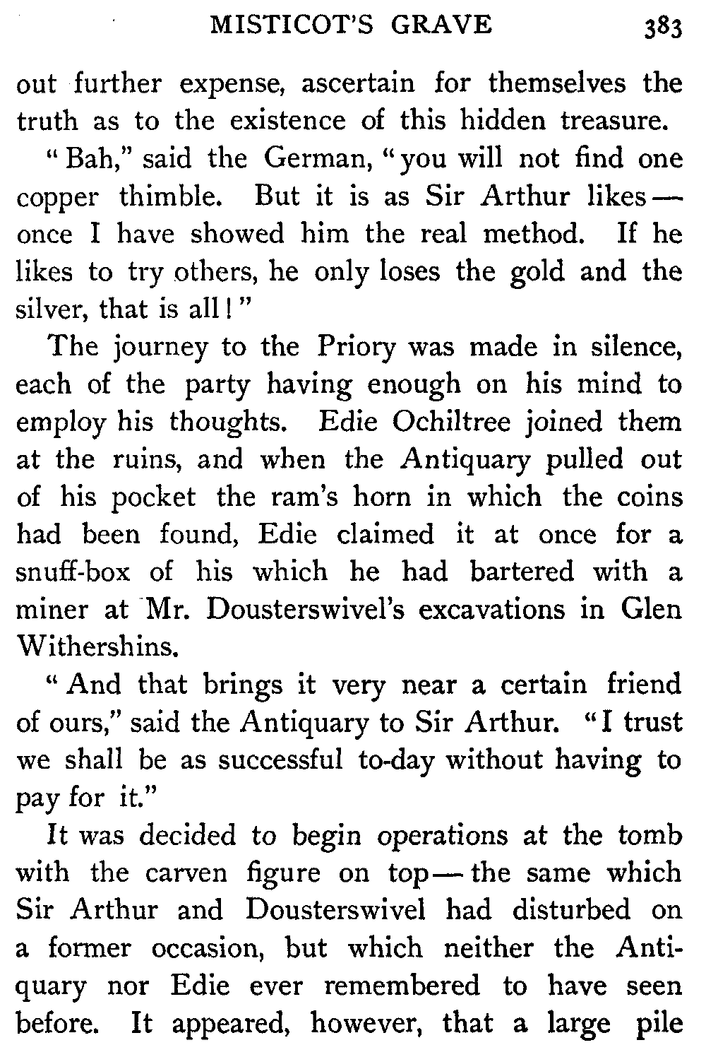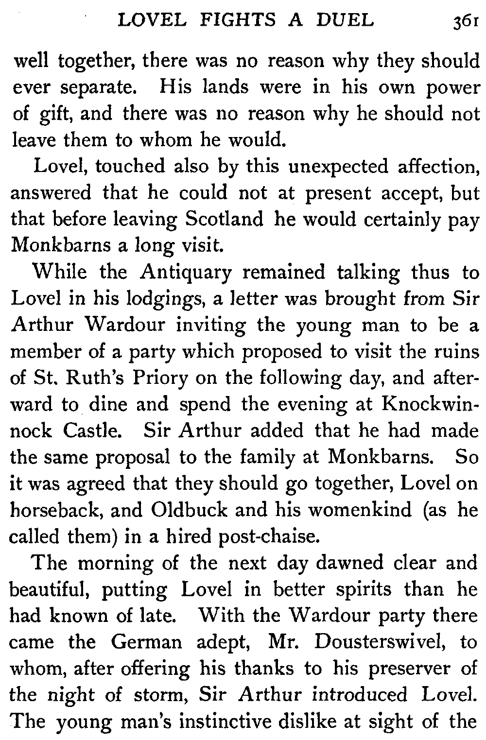 In the morning Lord Glenallan returned to the castle in his carriage, while Mr. Oldbuck, hearing from Hector that he was going down to Fairport,[406] in order to see that old Edie Ochiltree had fair play before the magistrates, offered to bear him company.