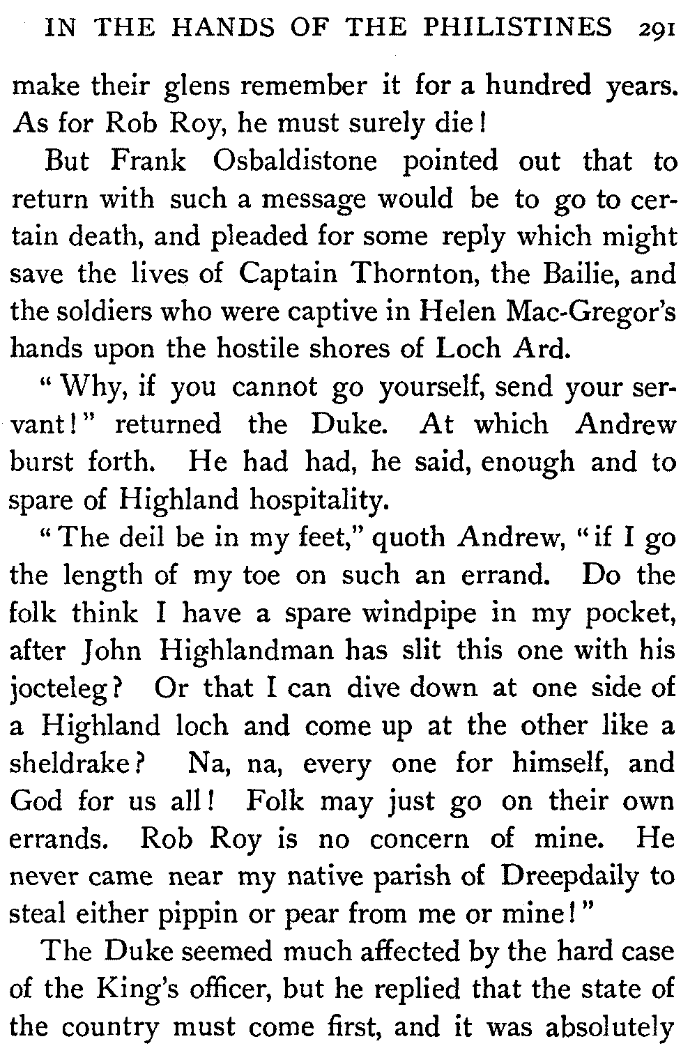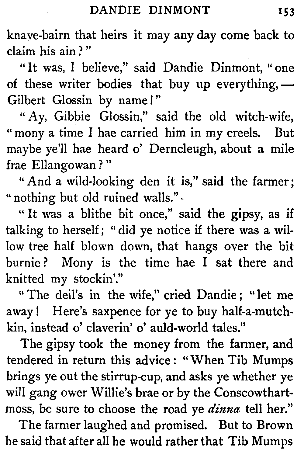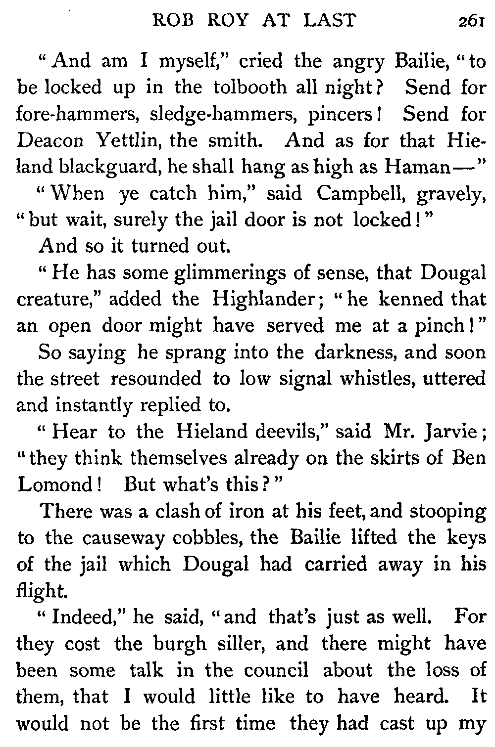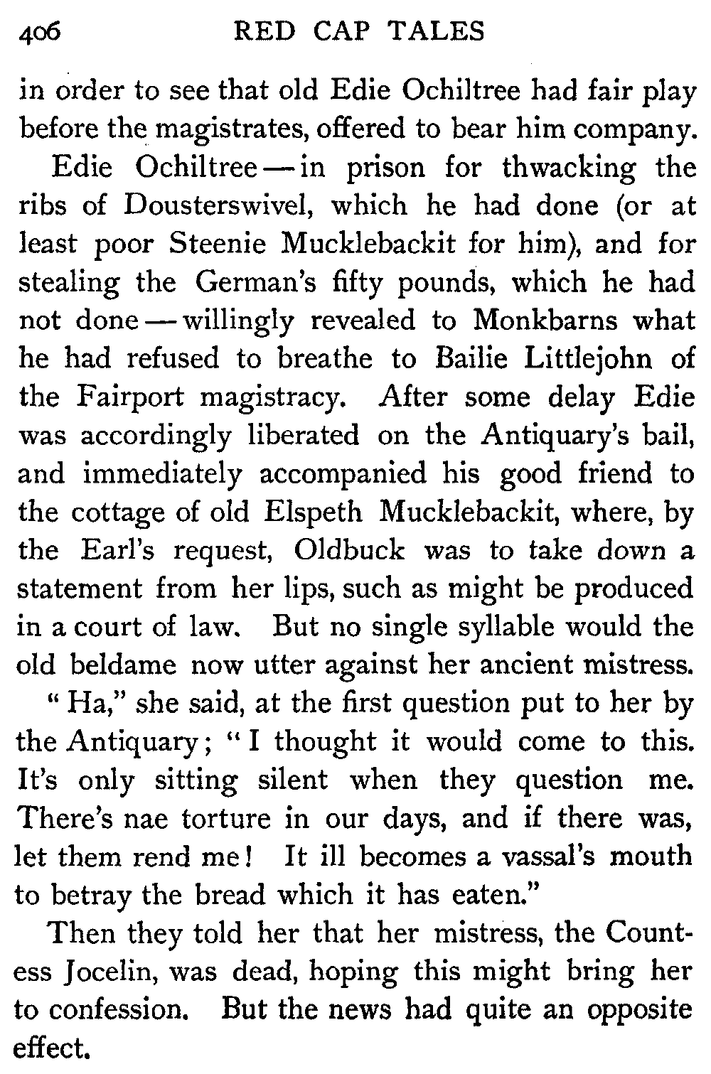 "Ha," she said, at the first question put to her by the Antiquary; "I thought it would come to this. It's only sitting silent when they question me. There's nae torture in our days, and if there was, let them rend me! It ill becomes a vassal's mouth to betray the bread which it has eaten."
