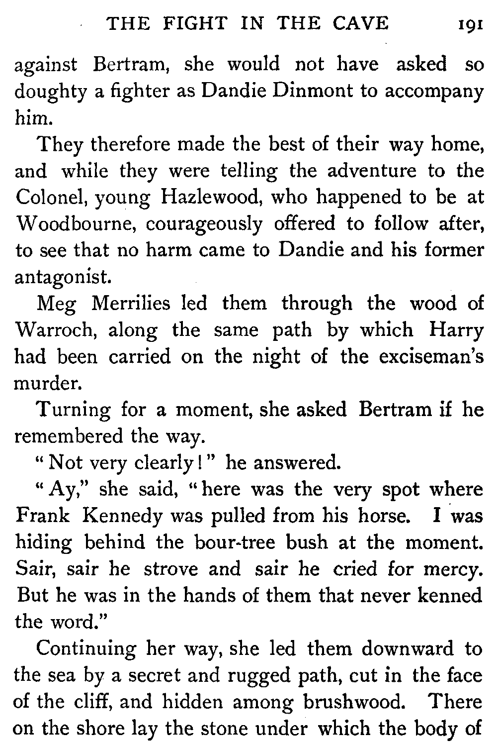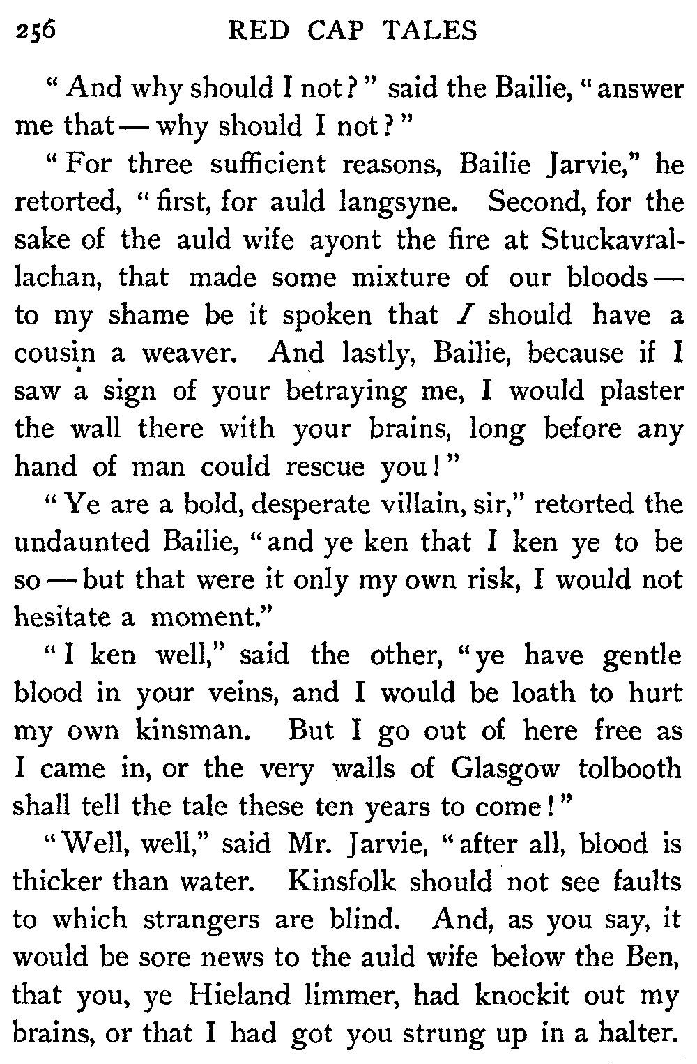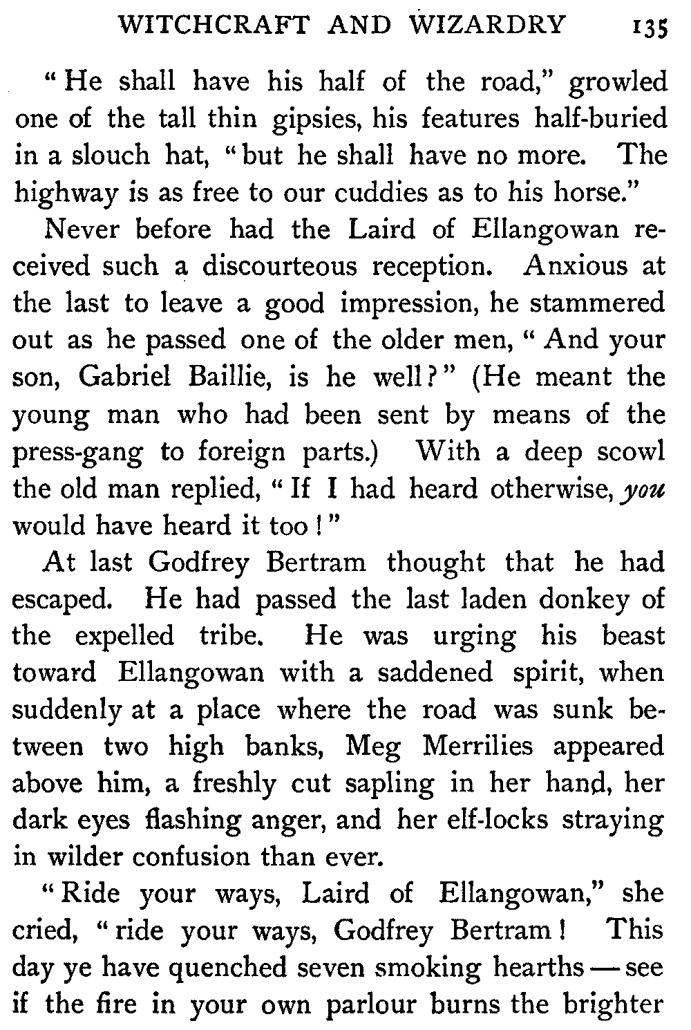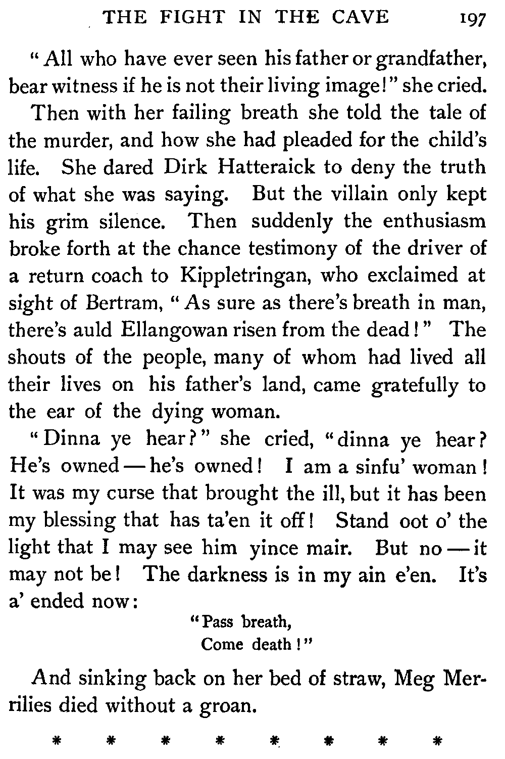 "Ha," she said, at the first question put to her by the Antiquary; "I thought it would come to this. It's only sitting silent when they question me. There's nae torture in our days, and if there was, let them rend me! It ill becomes a vassal's mouth to betray the bread which it has eaten."