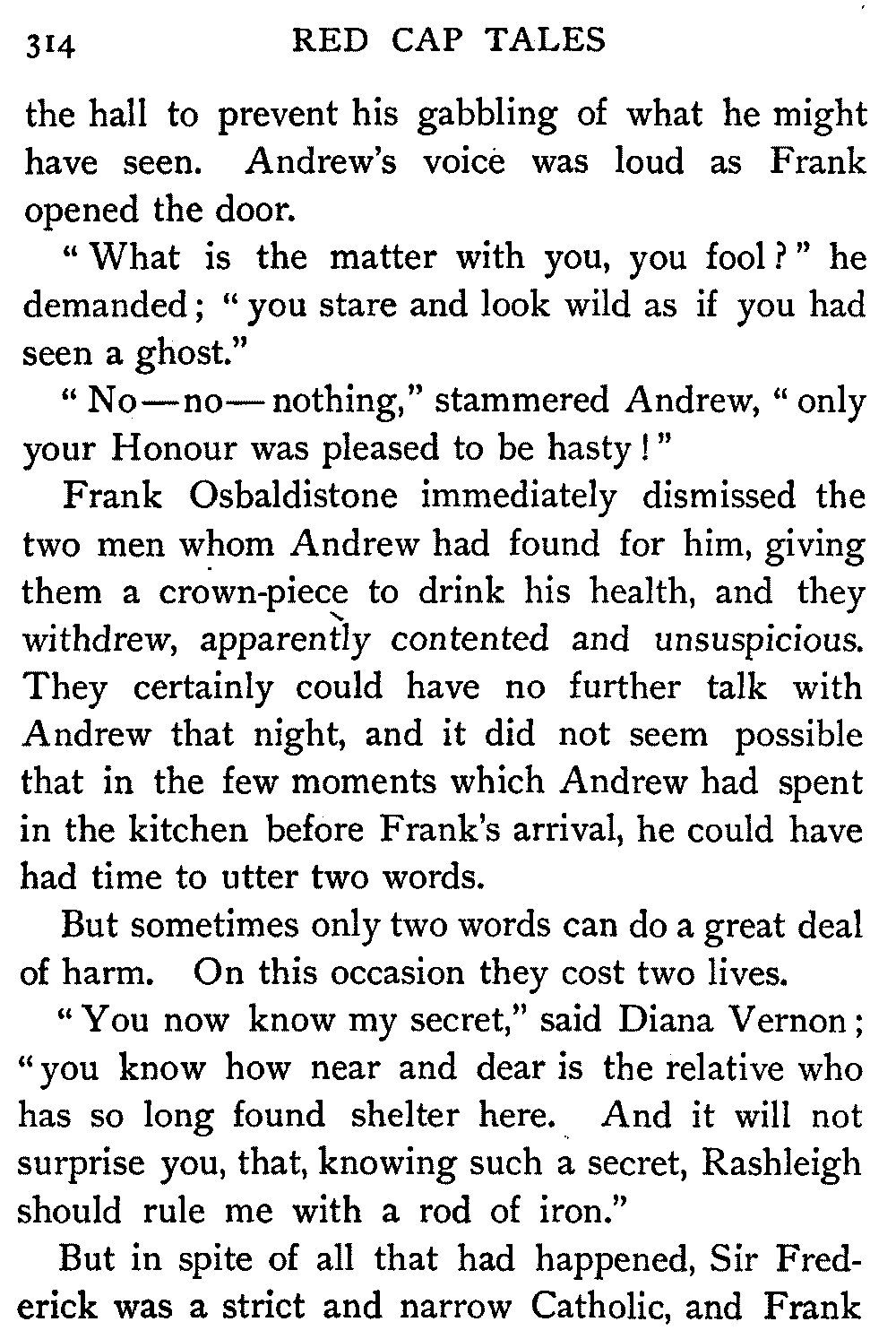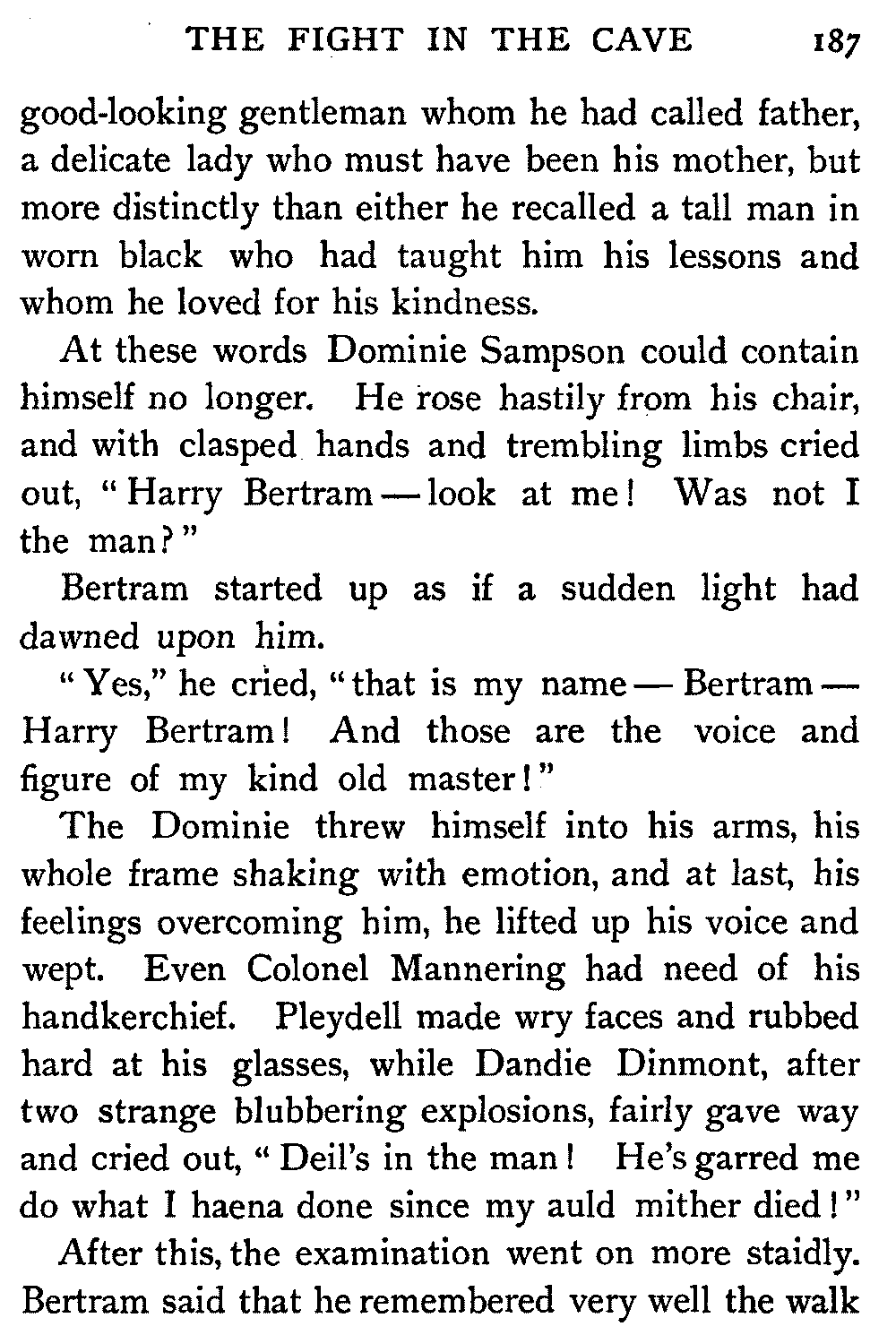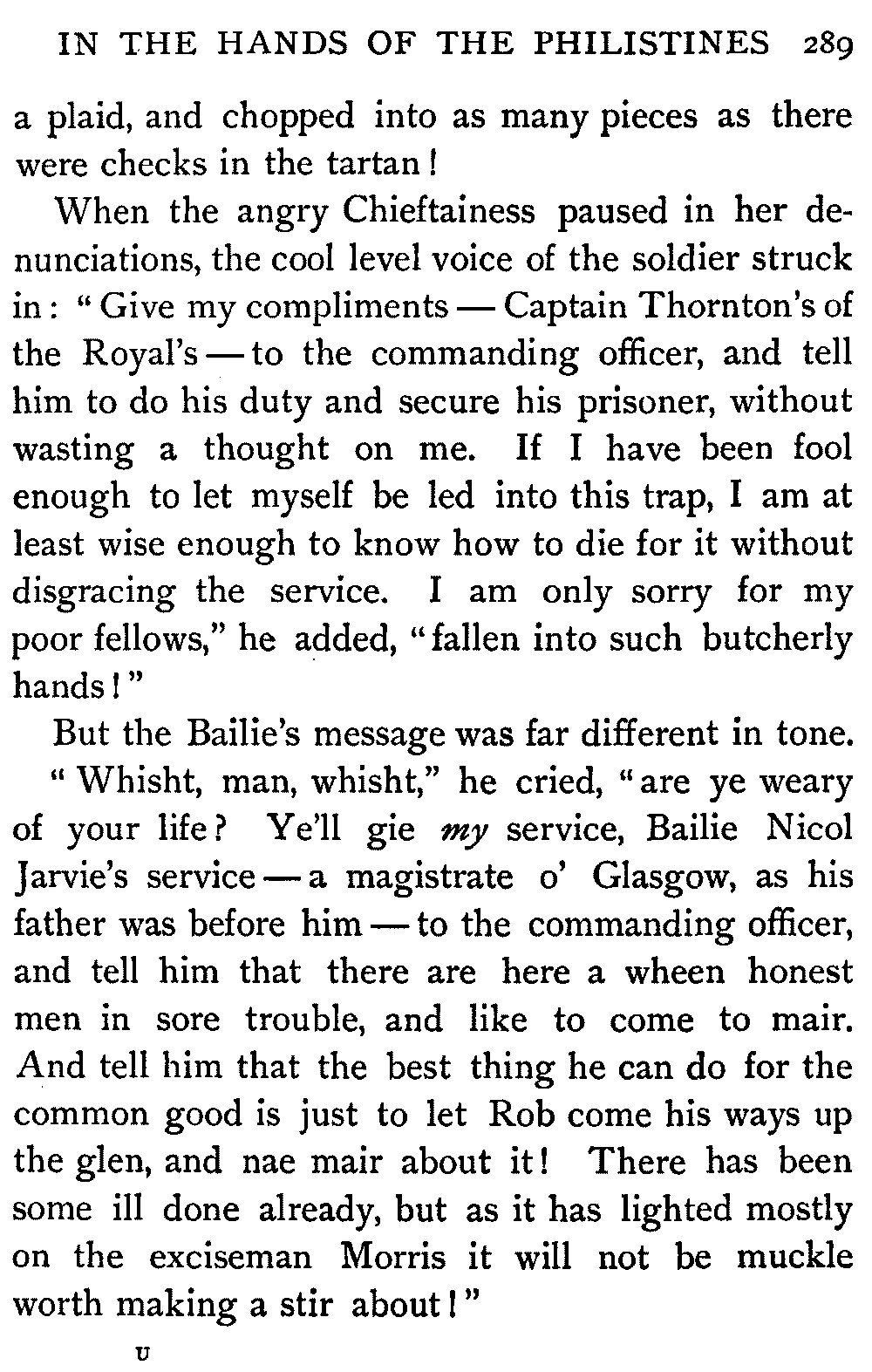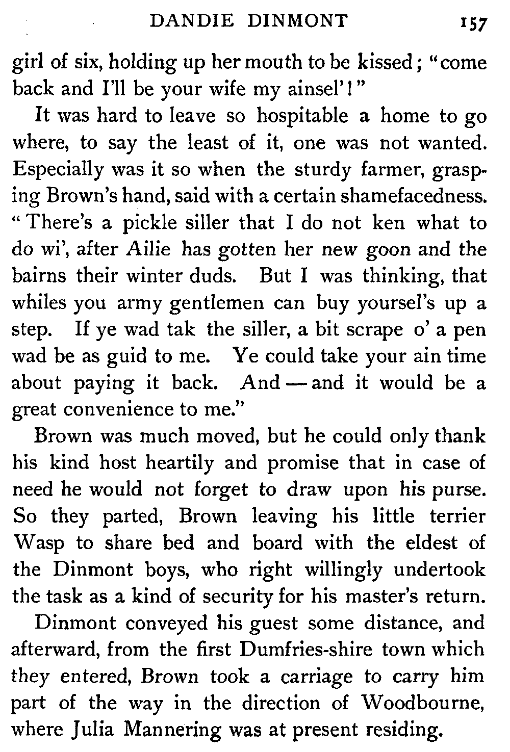 "Ha," she said, at the first question put to her by the Antiquary; "I thought it would come to this. It's only sitting silent when they question me. There's nae torture in our days, and if there was, let them rend me! It ill becomes a vassal's mouth to betray the bread which it has eaten."