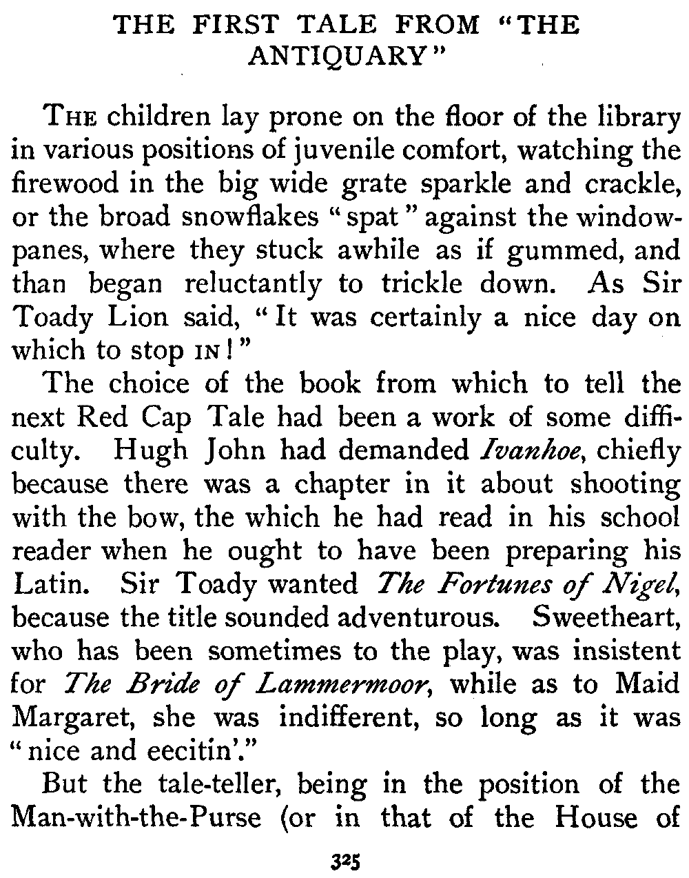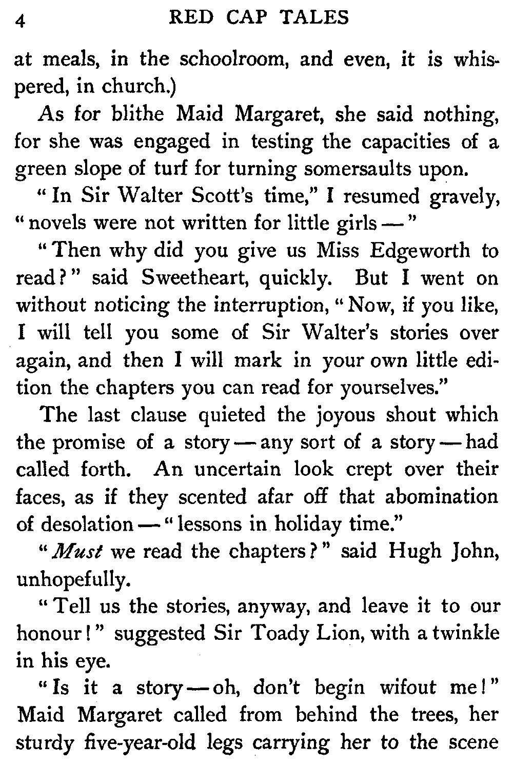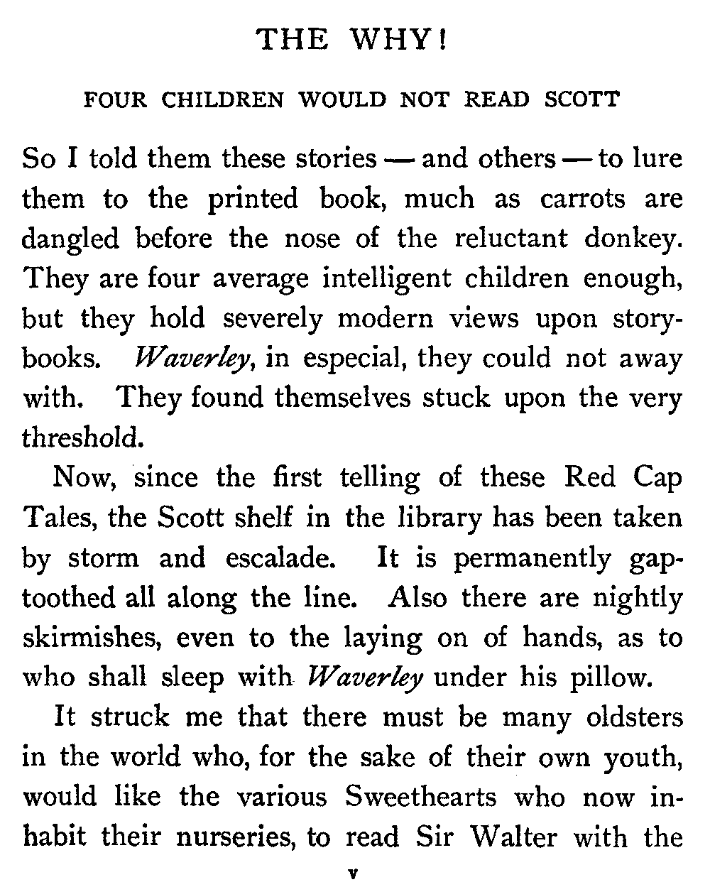 So I told them these stories—and others—to lure them to the printed book, much as carrots are dangled before the nose of the reluctant donkey. They are four average intelligent children enough, but they hold severely modern views upon storybooks. Waverley, in especial, they could not away with. They found themselves stuck upon the very threshold.