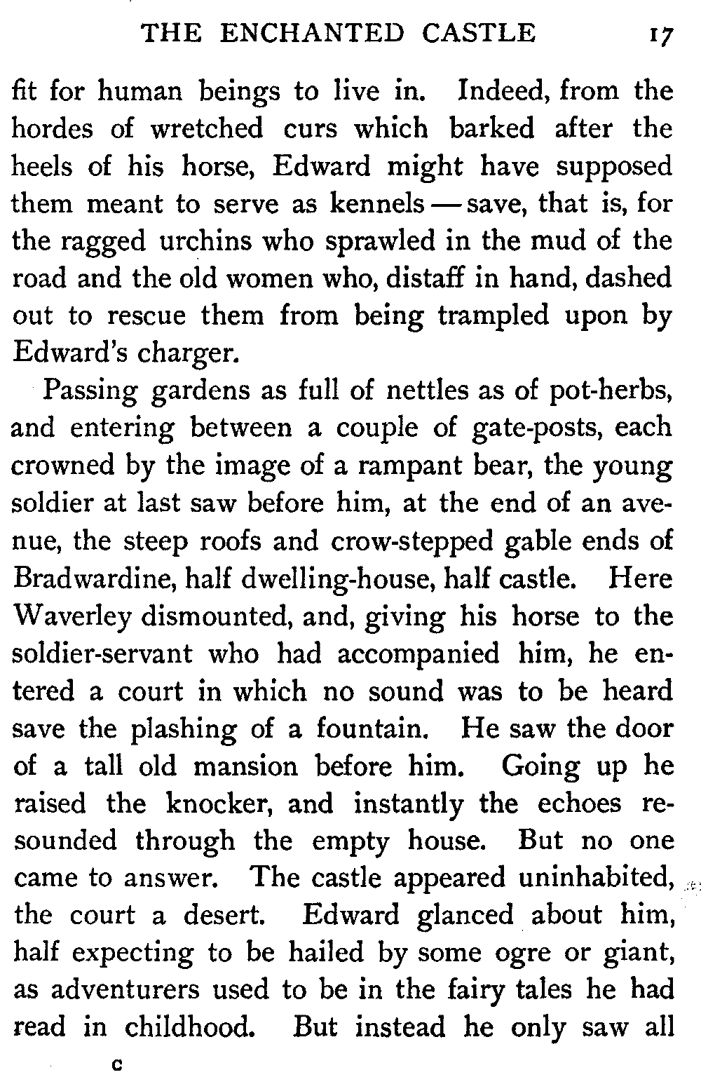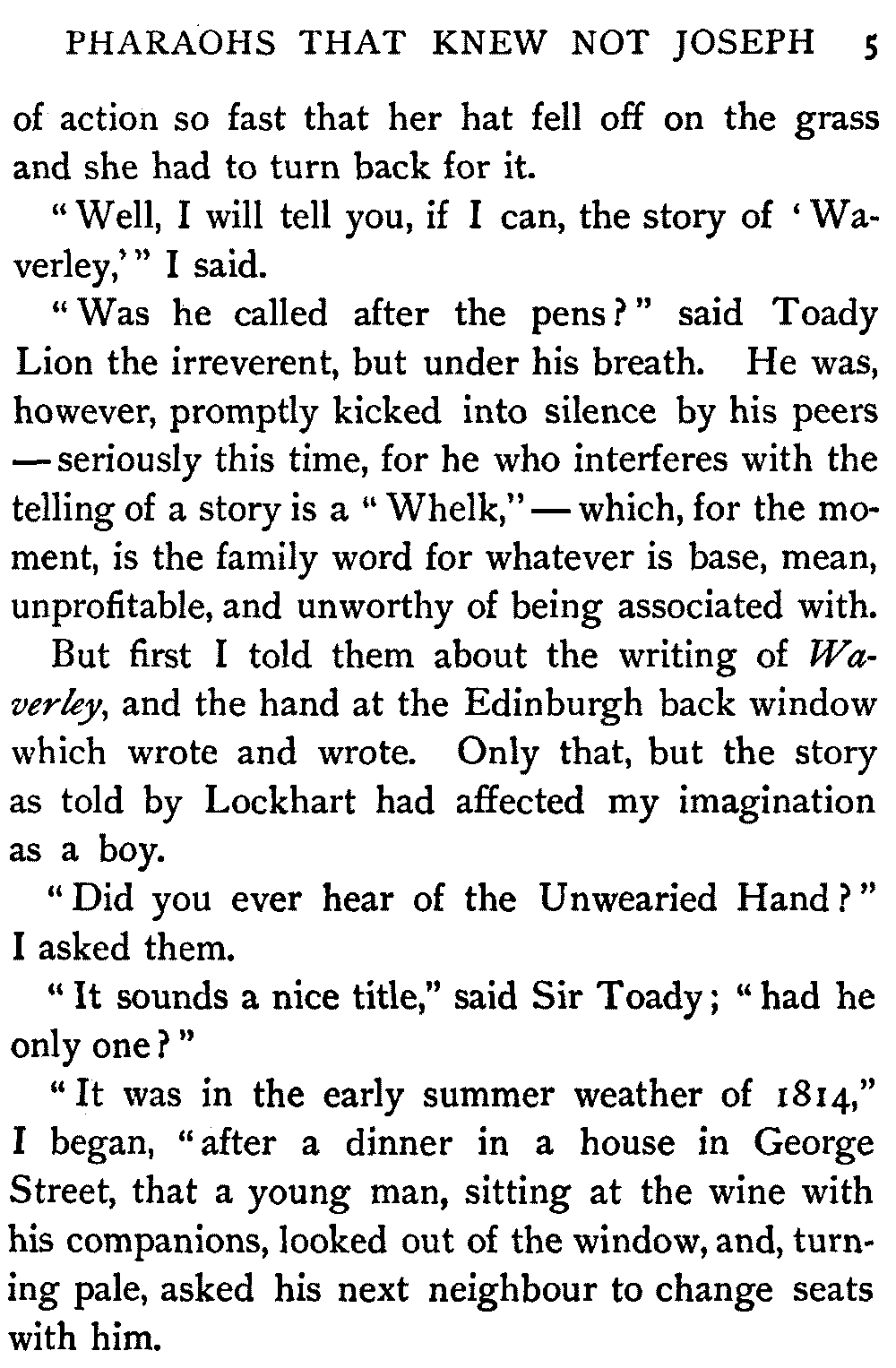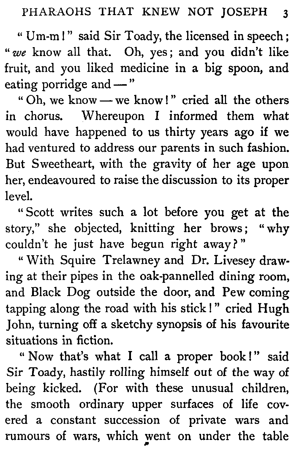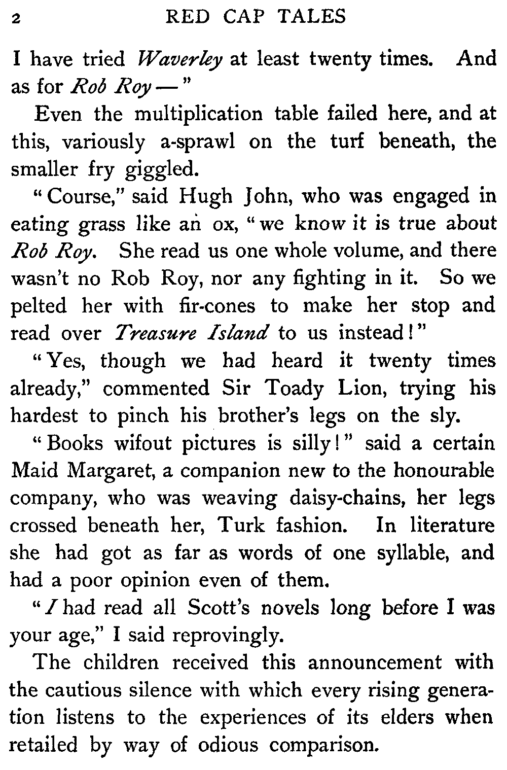 So I told them these stories—and others—to lure them to the printed book, much as carrots are dangled before the nose of the reluctant donkey. They are four average intelligent children enough, but they hold severely modern views upon storybooks. Waverley, in especial, they could not away with. They found themselves stuck upon the very threshold.
