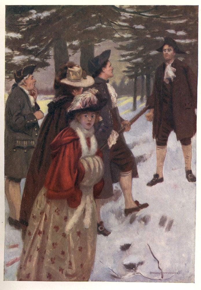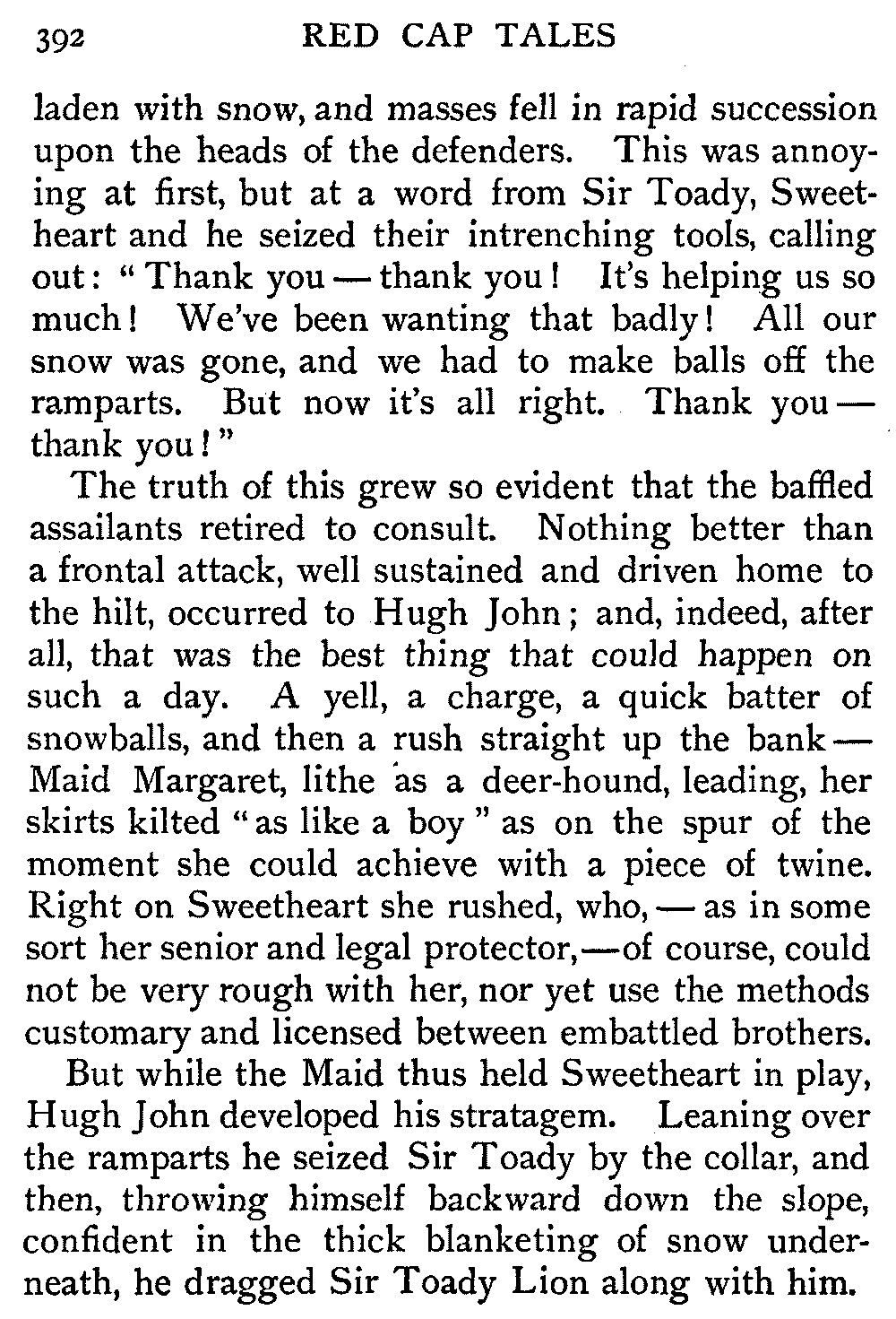 But while the Maid thus held Sweetheart in play, Hugh John developed his stratagem. Leaning over the ramparts he seized Sir Toady by the collar, and then, throwing himself backward down the slope, confident in the thick blanketing of snow underneath, he dragged Sir Toady Lion along with him.[393]