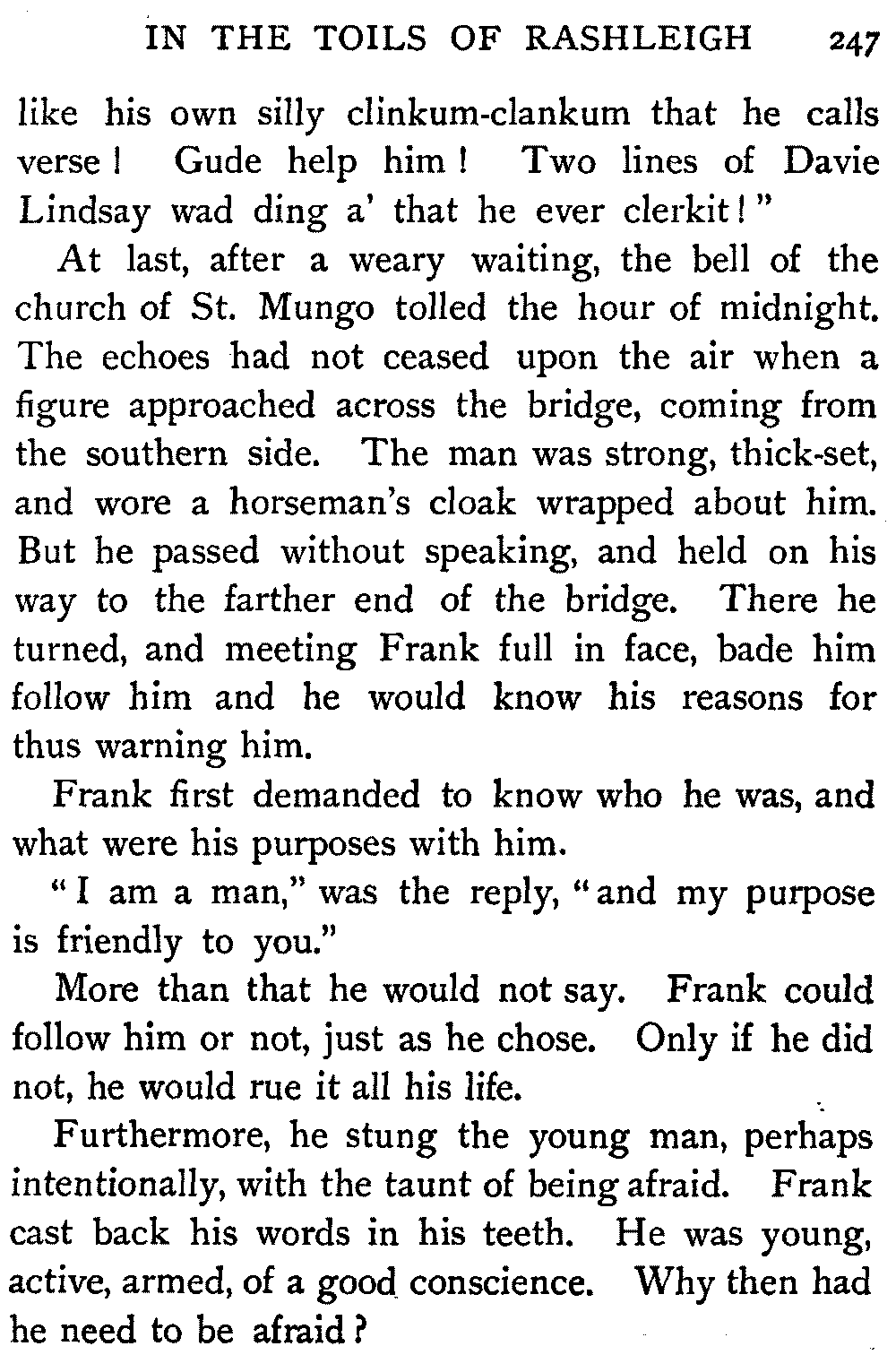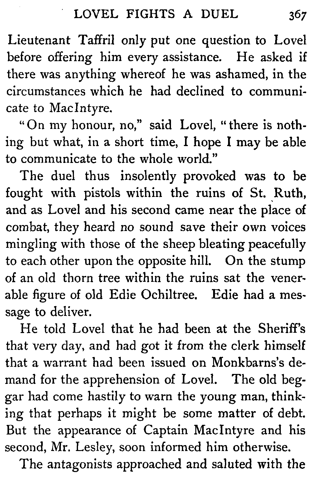However, by the help of an old soldier, one Francie Macraw, who had been his rear-rank man at Fontenoy, Edie Ochiltree was able after many delays to win a way to the Earl's presence—though the priests who were about his person evidently tried to keep everything connected with the outer world from his knowledge. The Earl, a tall, haggard, gloomy man, whose age seemed twice what it really was, stood holding the token ring in his hand. At first he took Edie for a father of his own church,[399] and demanded if any further penance were necessary to atone for his sin. But as soon as Edie declared his message, at the very first mention of the name of Elspeth of the Craigburnfoot, the Earl's cheek became even more deathlike than it had been at Edie's entrance.